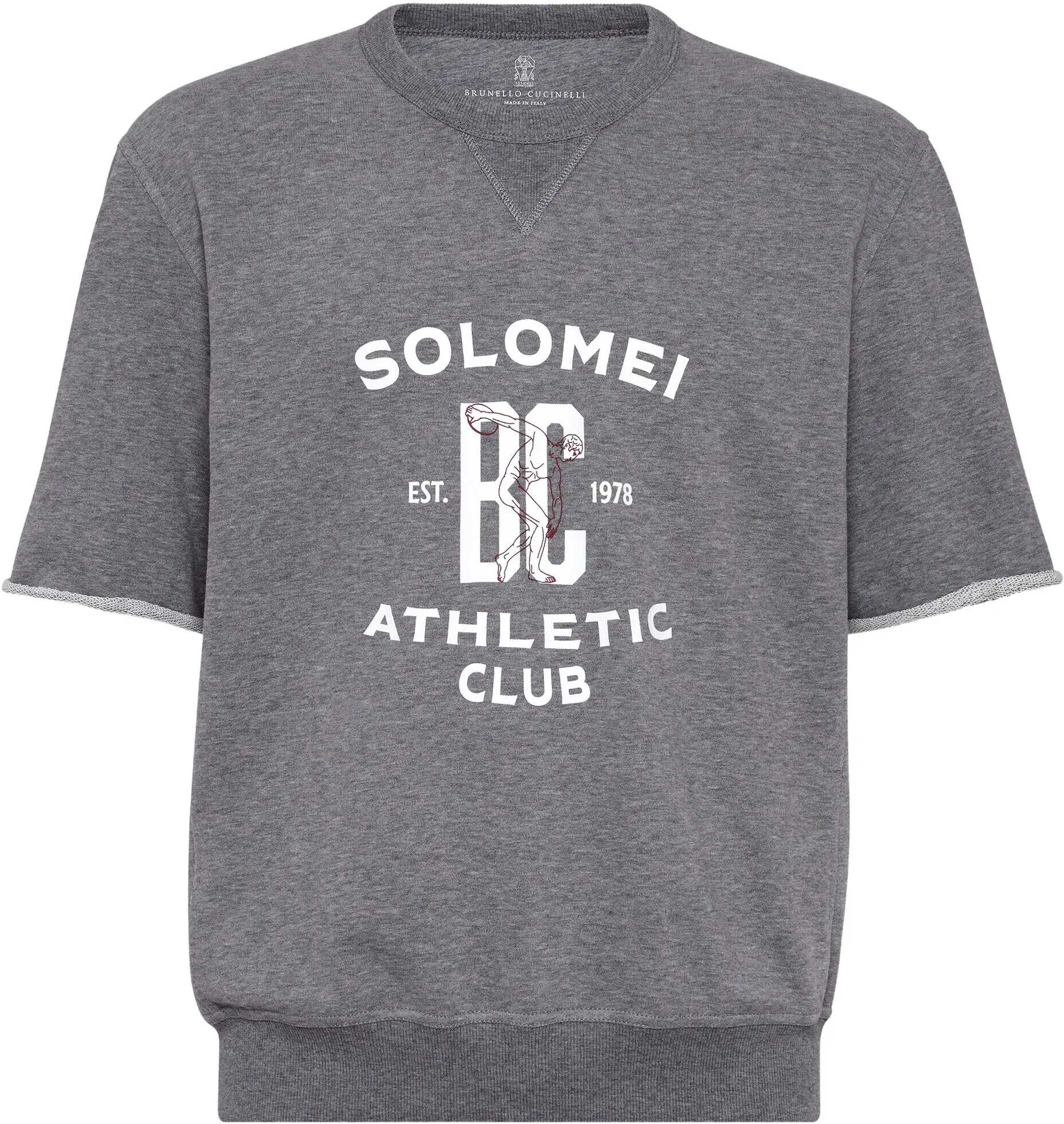 Brunello Cucinelli's Cotton Sweatshirt is a simple yet sophisticated piece, featuring a short-sleeved design and a ribbed crew neck that adds a touch of sophistication. The sleeves feature a rolled hem, while the high ribbed hem gives a clean, modern finish. The iconic contrasting monogram on the front enhances the design with a distinctive brand detail. Perfect for a casual yet stylish look, this sweatshirt combines comfort and style in a versatile garment.