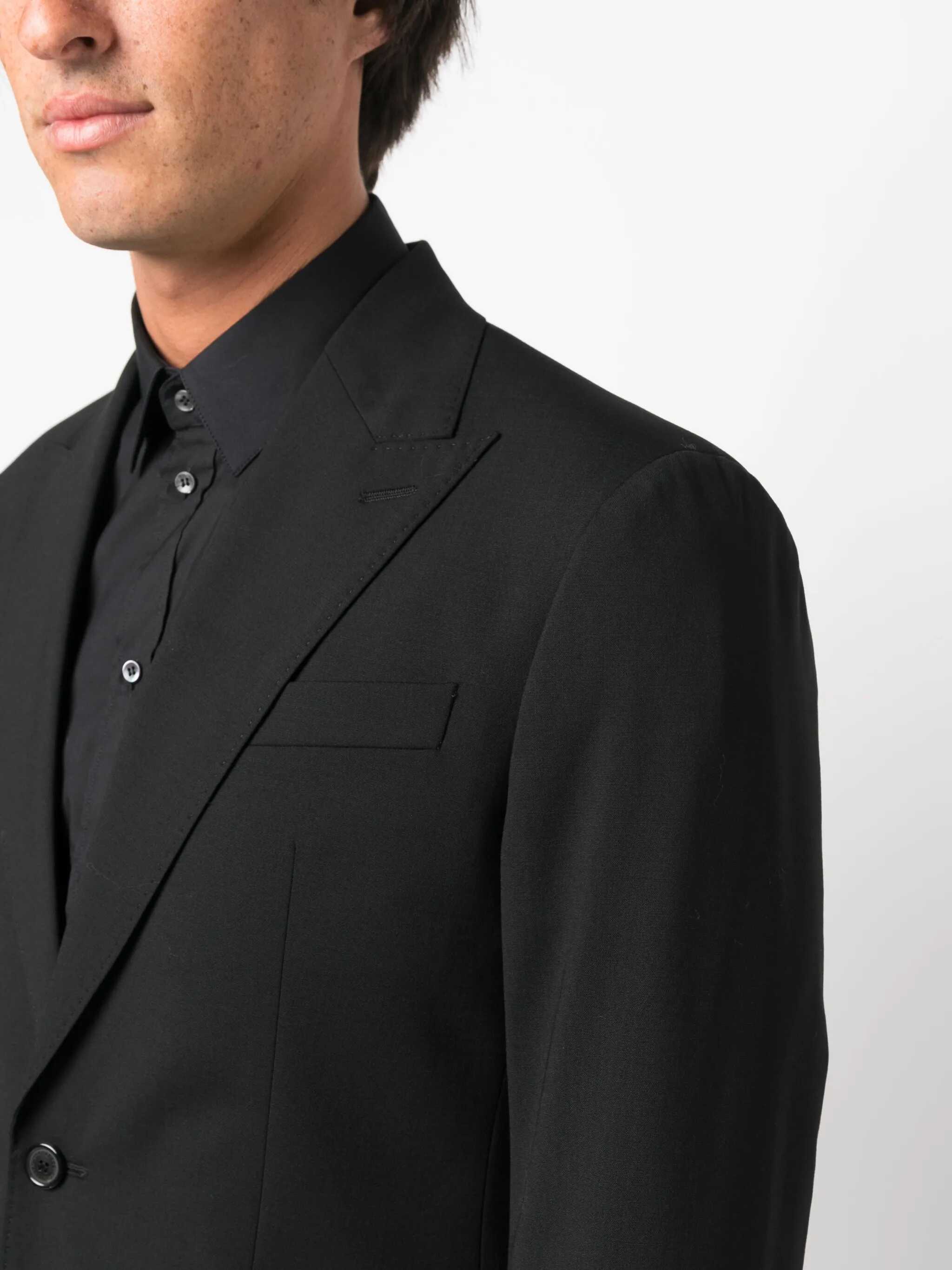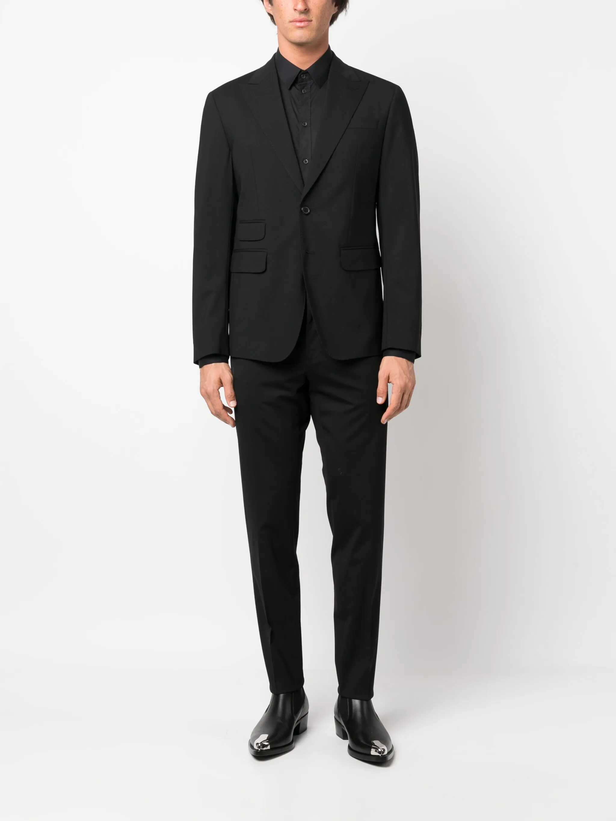 Dsquared2 Virgin Wool London Suit, consisting of jacket and pants. Wool blazer jacket, front button closure, three welt pockets on the front with flap, one slit pocket on the front, peaked lapels. Classic wool pants, front zipper and button closure, two welt pockets on the side, two welt pockets on the back.