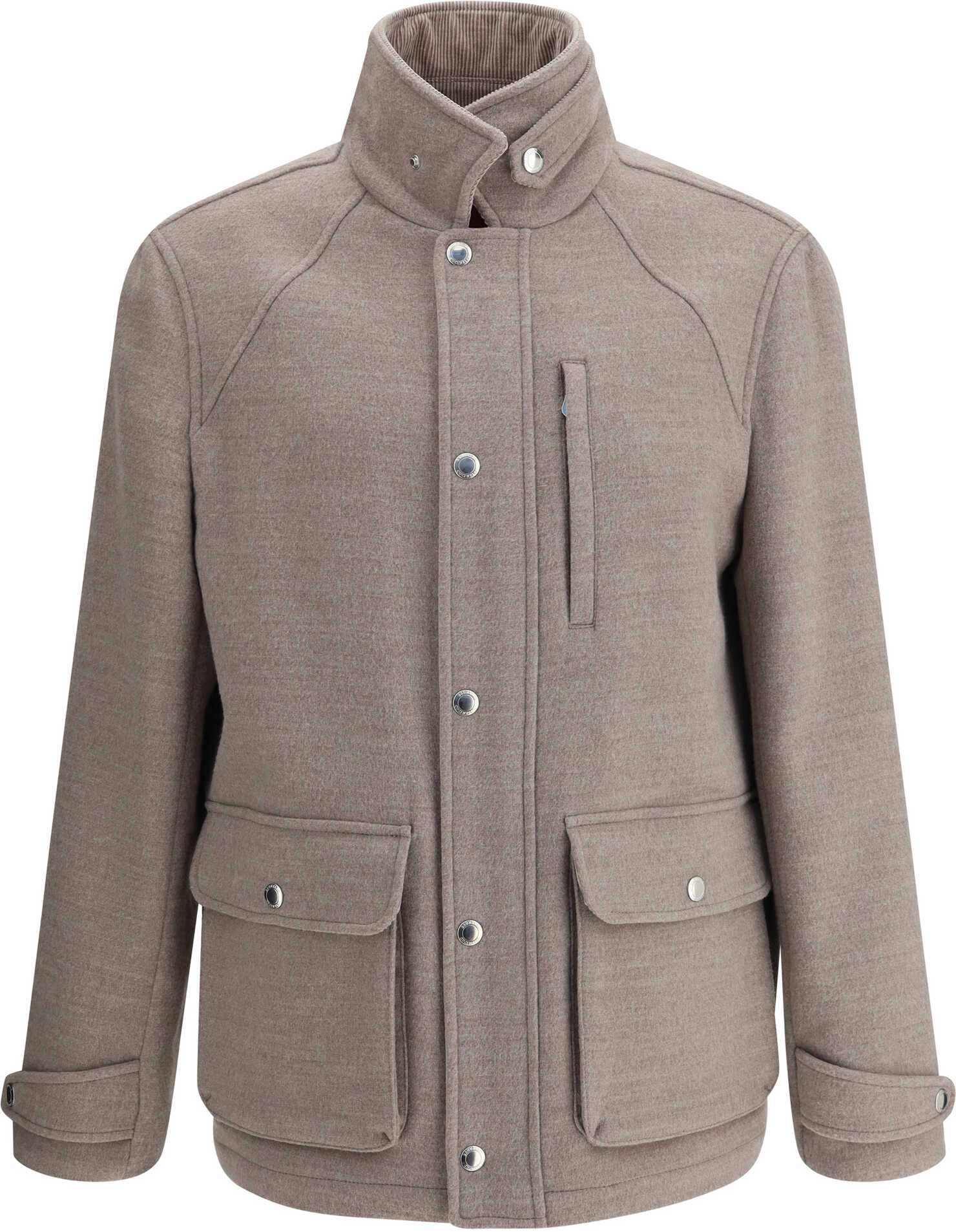 Brunello Cucinelli's wool Jacket is a sophisticated and functional piece with a high collar fitted with a flap and button to close it, adding an elegant touch. The double-slider front zipper closure, enhanced with a flap and buttons, gives it a distinctive and practical design. The two flap patch pockets on the front provide ample space, while the vertical zippered breast pocket adds an element of functionality. Adjustable button cuffs complete the look, ensuring a custom fit and a touch of refined style.
