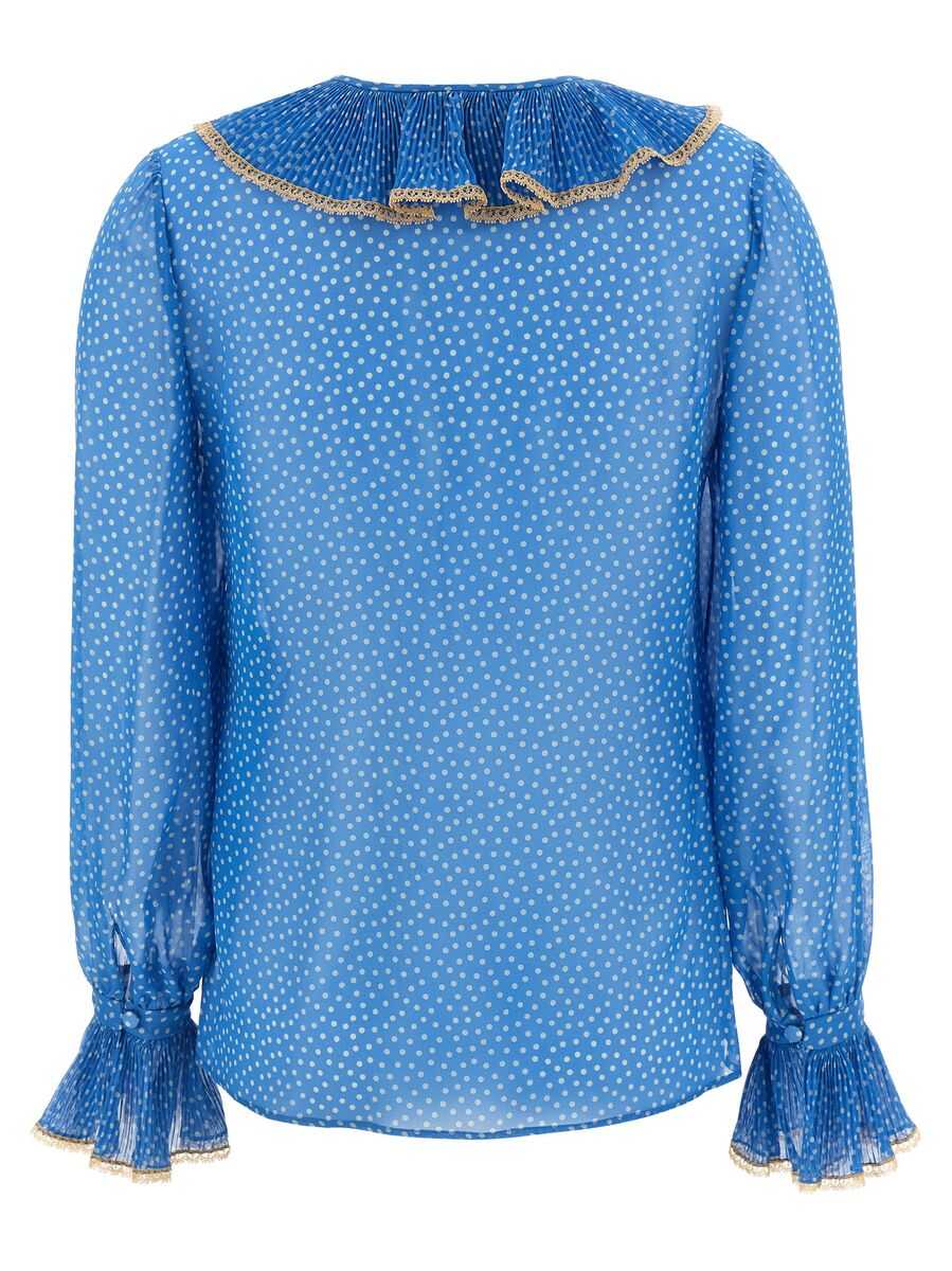 Shirt in semi-transparent silk georgette with micro-polka dot print, round neckline with pleated flounce, knotted cord, button closure, long sleeves with cuffs and flounce detail on the hem