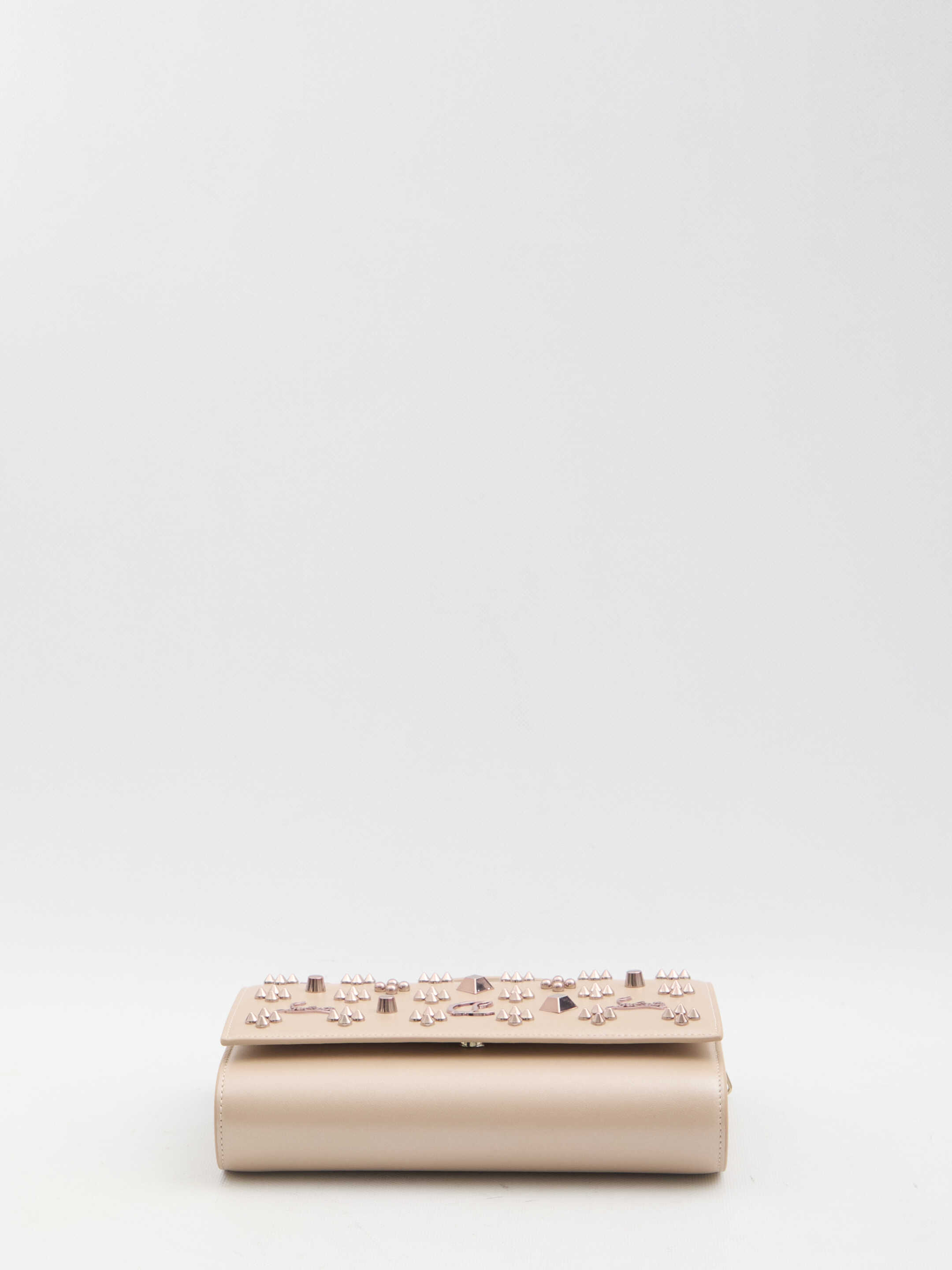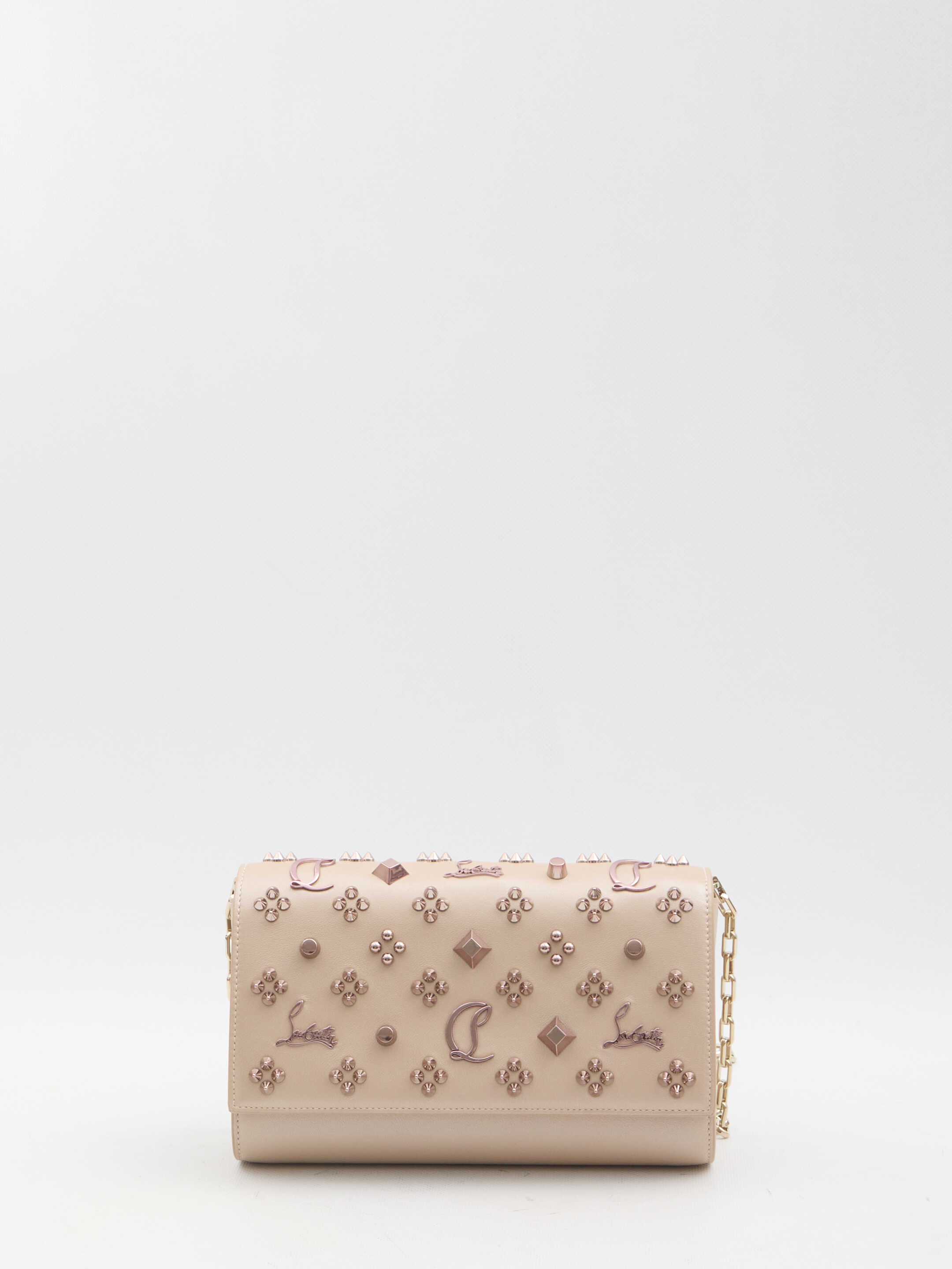 Paloma clutch in pearlescent "Leche" pink nappa leather, embellished with rose gold Loubinthesky studs, logo, and spikes. It features a flap with magnetic closure, removable shoulder strap, three interior compartments, one with zip closure, four card slots, and one flat internal pocket. Dust bag included. Any irregularities in the leather are not to be considered manufacturing defects but rather a characteristic of the material.