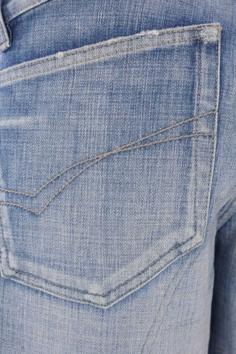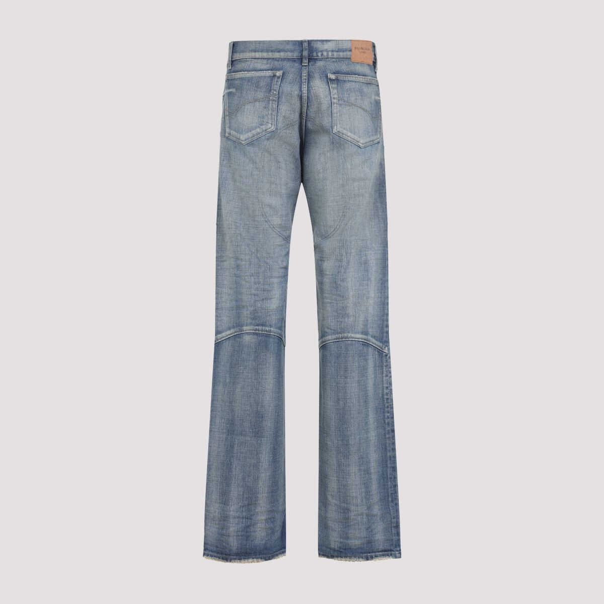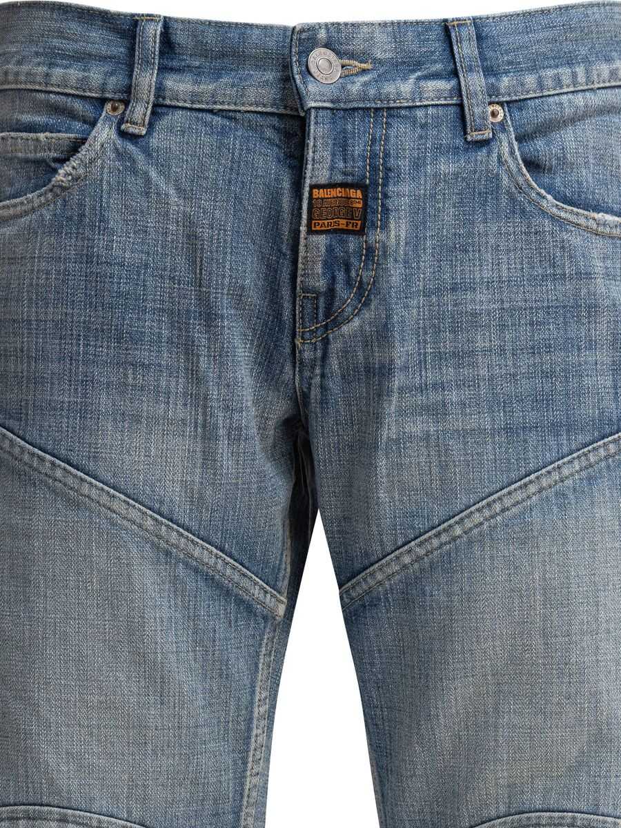 Balenciaga low-waist jeans crafted from light blue cotton denim. Featuring a front closure with metal button and zip, belt loops, classic five-pocket styling, distressed-effect edges, and a logo patch on the back.