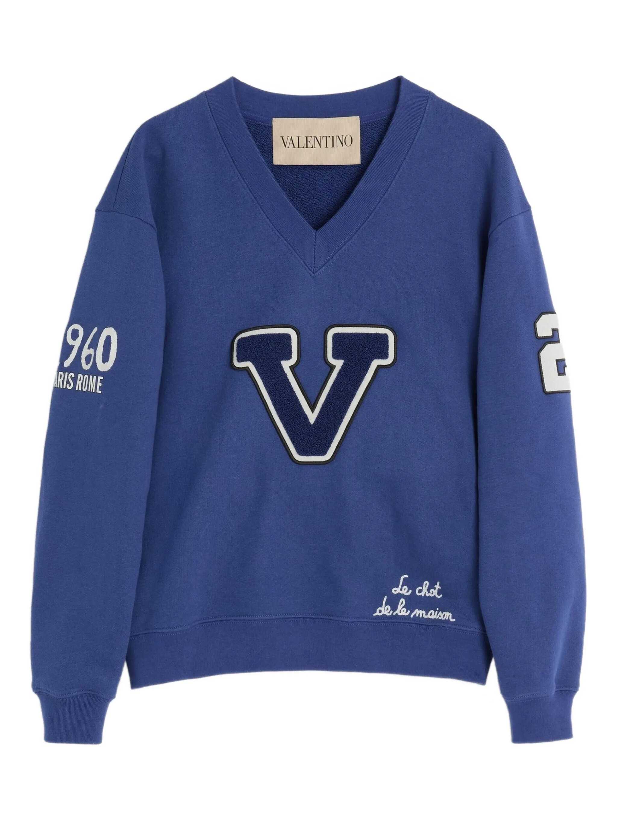 Brushed cotton sweatshirt, collage pattern, V-neck, patch embroidery and 'Chat de la Maison' prints, long cuffed sleeves.