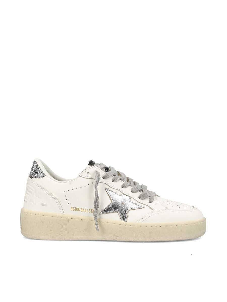 Inspired by 1980s basketball iconography, Golden Goose's Ball Star 2 sneakers combine vintage vibes and glamorous details. The brand's signature lived-in design is enriched with silver and glitter inserts for a bold and bright reinterpretation of contemporary streetwear. - Upper: 97% cowhide, 2% polyethylene terephthalate, 1% cotton - Color: white and silver - Lining: 34% cotton, 31% cowhide, 24% polyurethane textile, 7% viscose, 4% polyester - Sole: 100% rubber - Silver laminated leather star - Glitter heel - Ice gray laces - Vintage treatment - Hand-made in Italy - Box included - Item code: GWF00804F00696680185