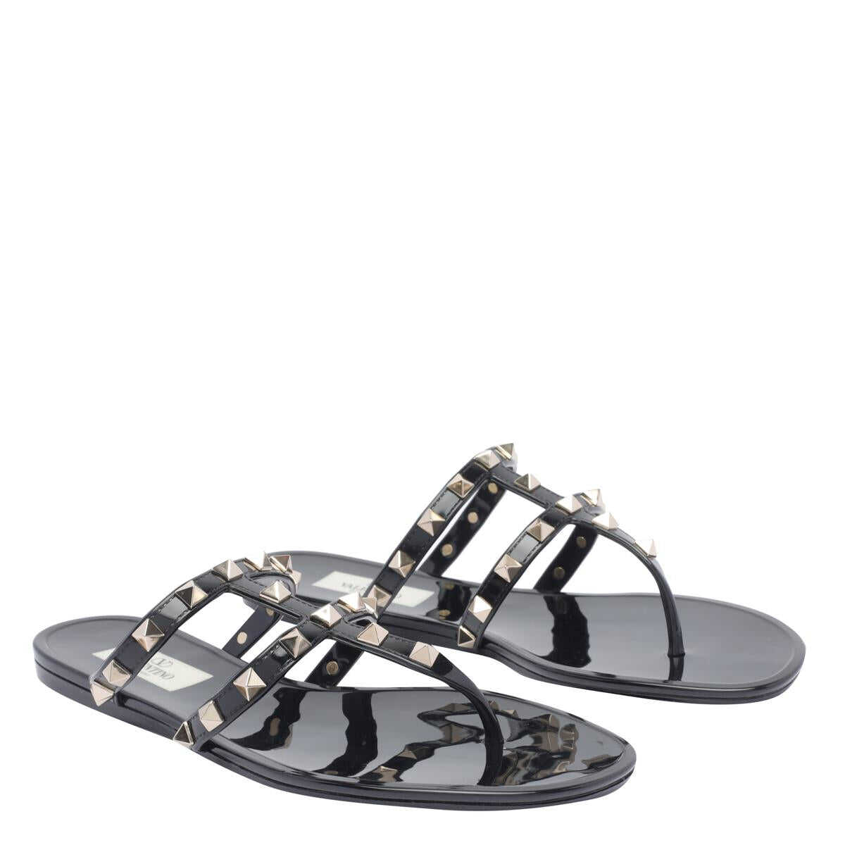 Valentino Garavani Black Rockstud Flat Rubber Sandal, Leather Upper, Studs Logo Details, Open Round Toe, EU SIZE (IT)