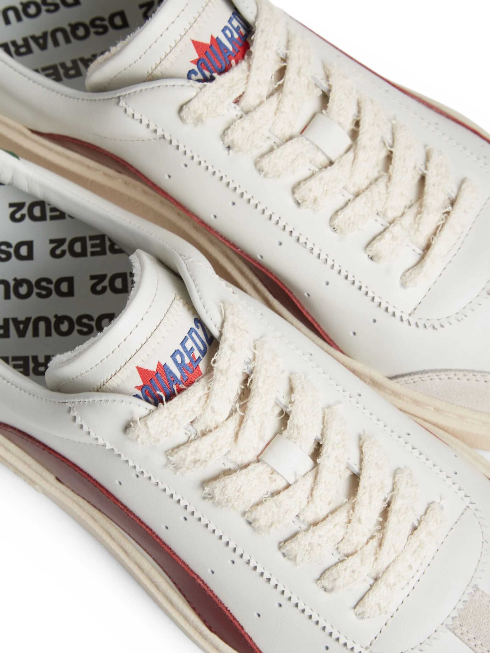 Dsquared2 low-top sneakers made of smooth white leather with a light grey suede toe and contrasting details. Featuring lace-up closure, round toe, terry cloth/leather lining, and rubber sole. The design is completed by the signature logo label on the tongue, side “1964” print, and contrasting heel tab with Dean/Dan print.