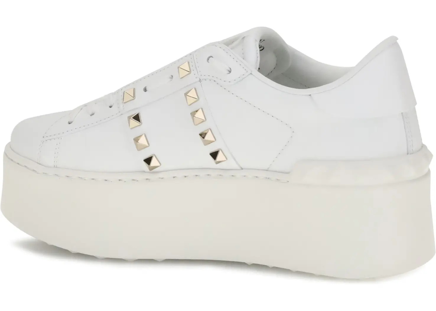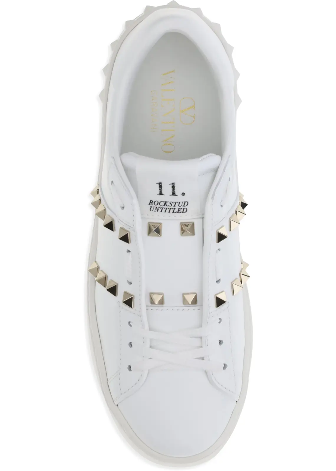 Valentino Garavani's Rockstud Untitled Flatform Sneakers reinterpret an iconic model with a contemporary twist. Made of smooth calfskin, they are distinguished by a platinum-finish studded band, emblematic of the brand's gritty style. The special label with the number 11 celebrates its membership in the Untitled collection. Complemented by a rubber flatform sole with embossed studs on the back, they combine height, comfort and personality.