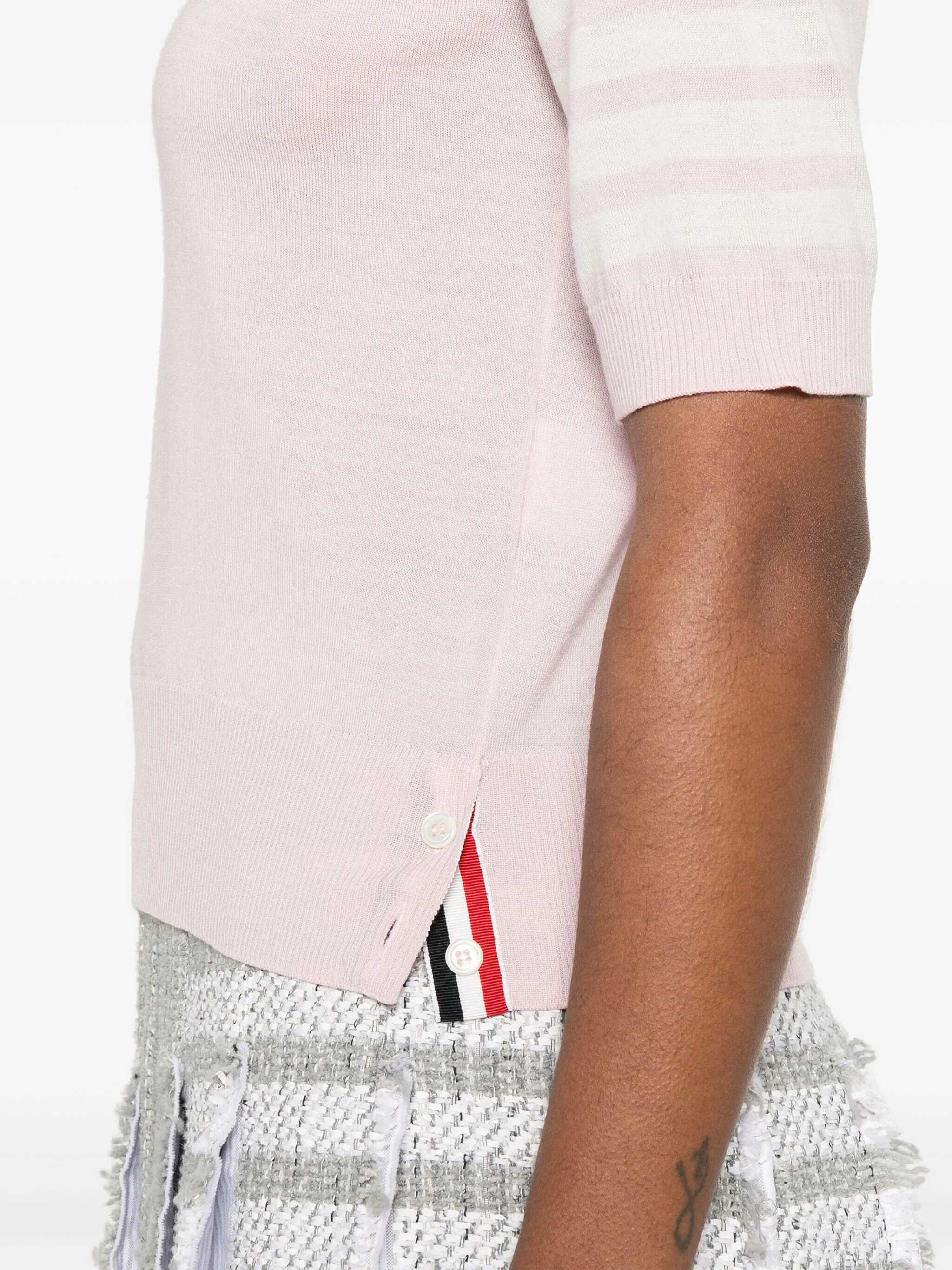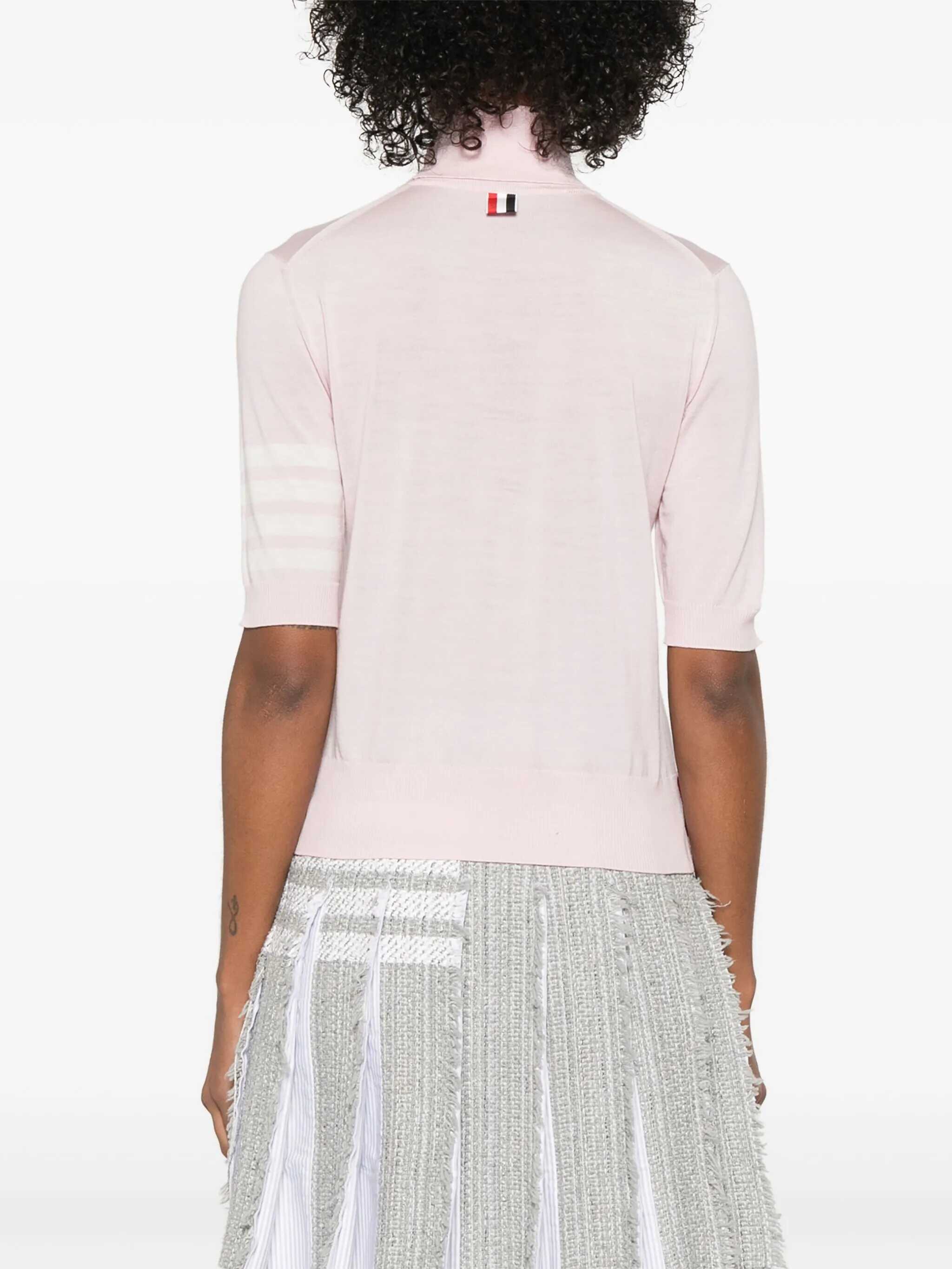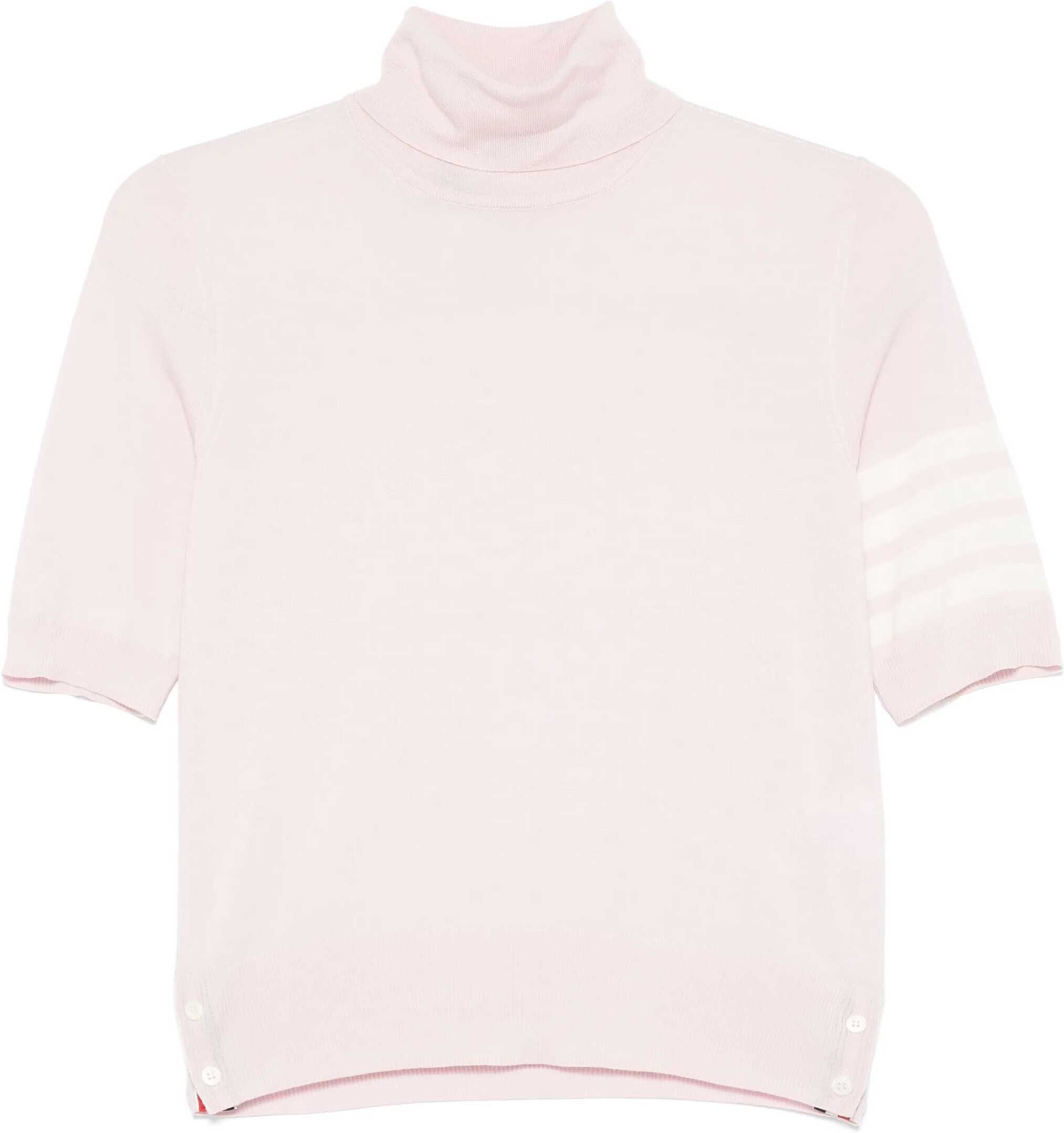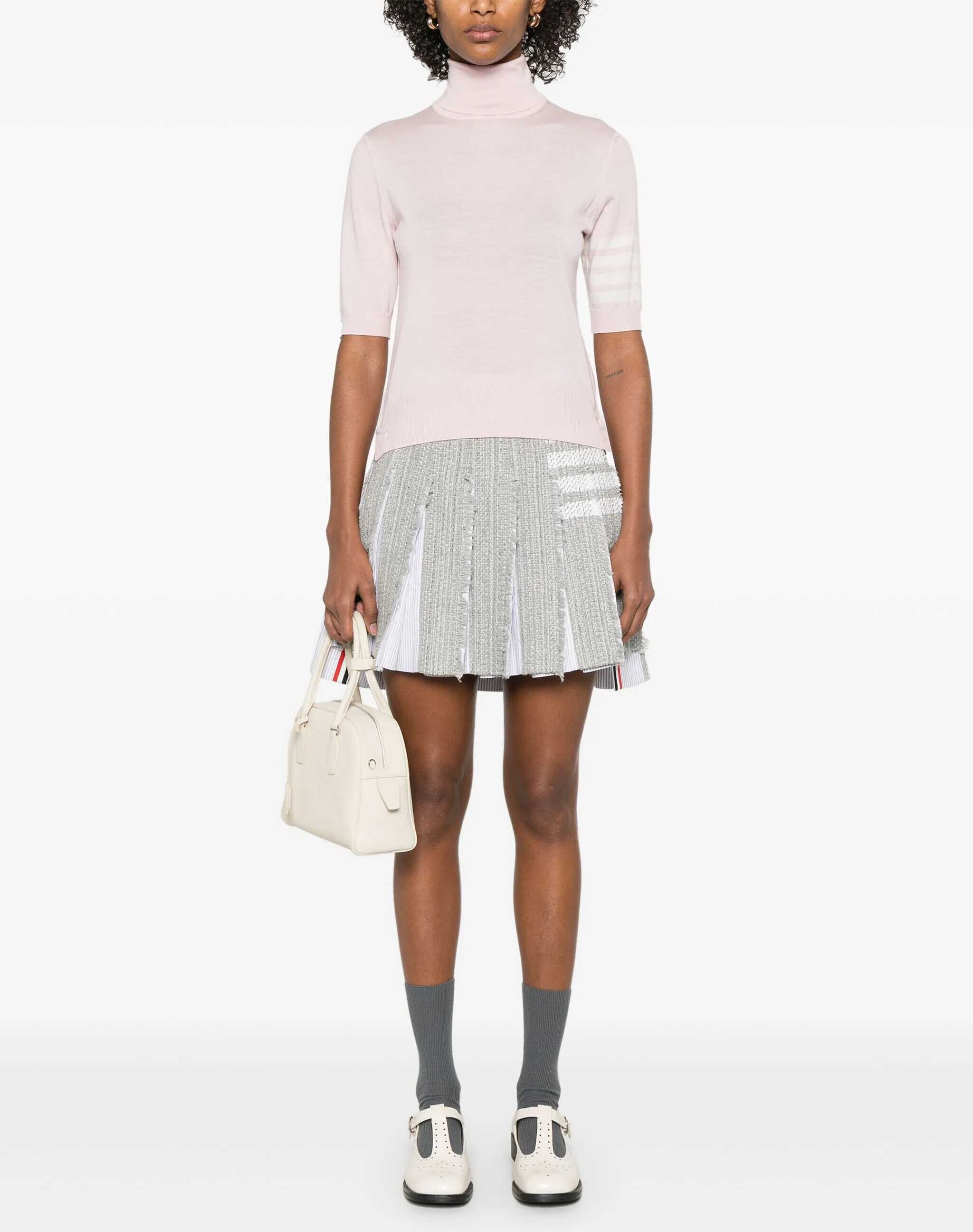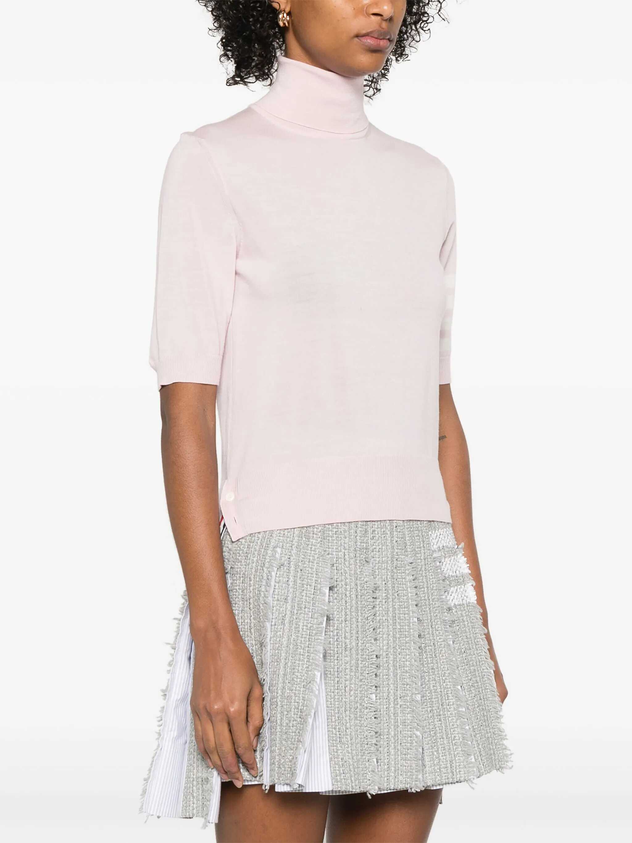 Thom Browne's Virgin Wool Turtleneck Sweater is a refined and sophisticated piece that combines elegance with distinctive details. With a ribbed turtleneck and short sleeves, it features a monochrome pattern enhanced by contrasting hems. The brand's iconic bands on the left sleeve and the ribbed hem with slight side slits add a touch of originality.