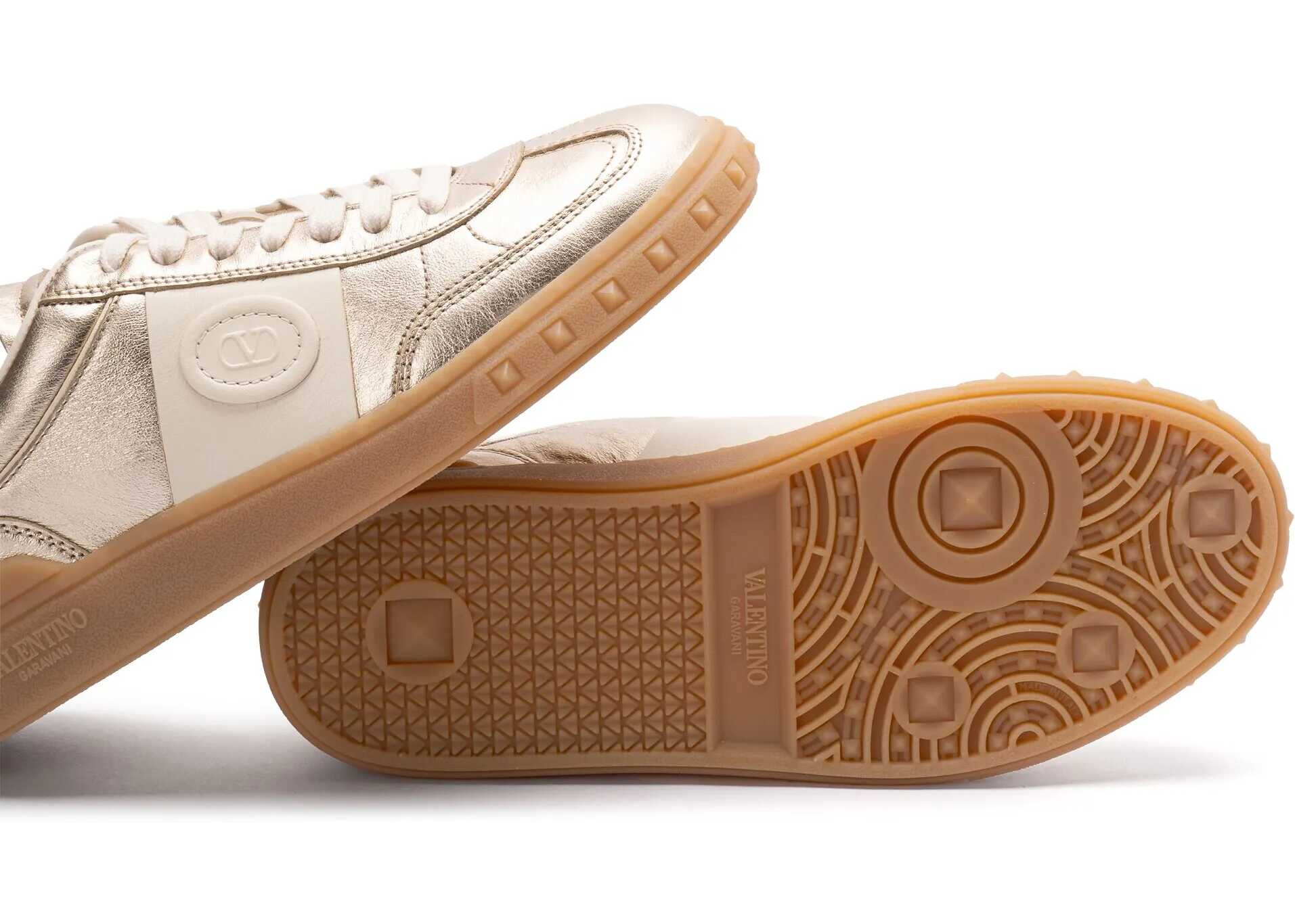 Valentino Garavani's Upvillage Sneakers in laminated calf leather combine light and character in a contemporary silhouette. The tasseled calf leather band creates an elegant contrast, on which the Valentino Garavani logo, also featured on the tongue, stands out. The rubber sole, personalized with the iconic stud detail, completes the design with a gritty and distinctive touch.