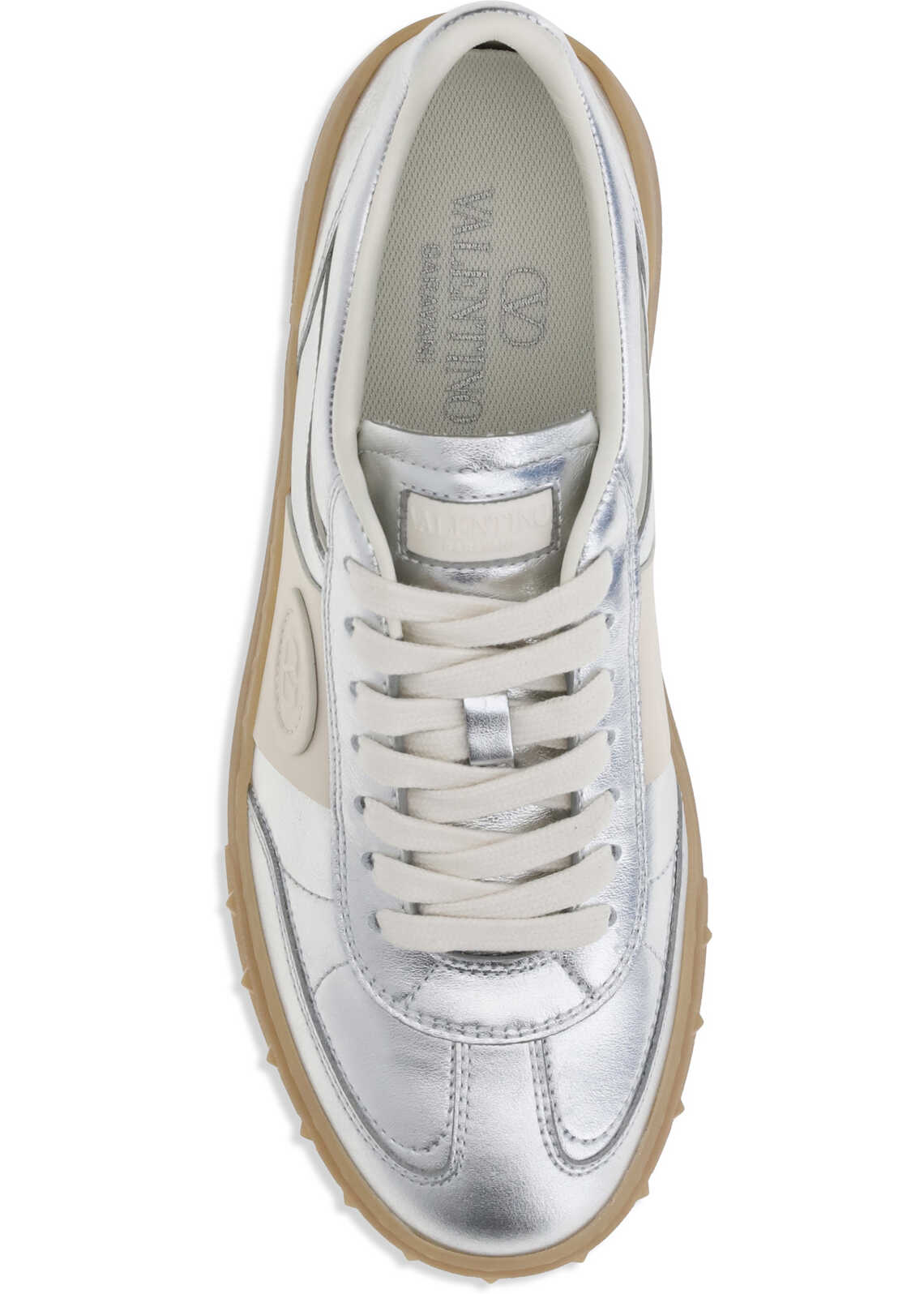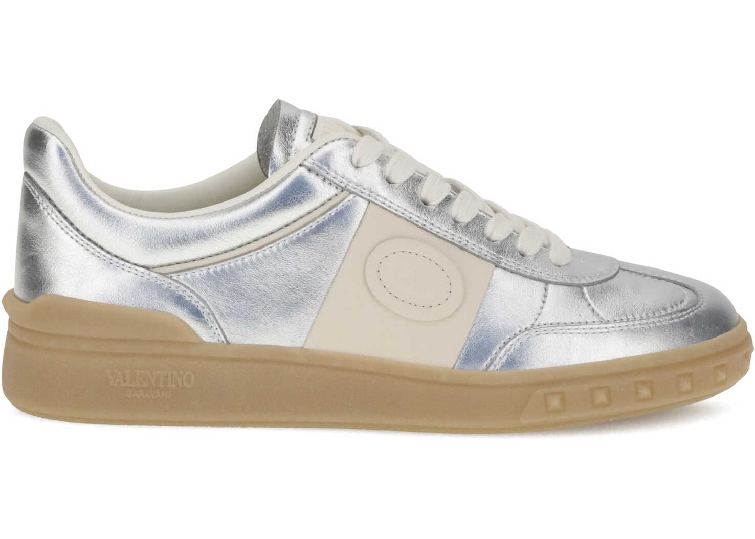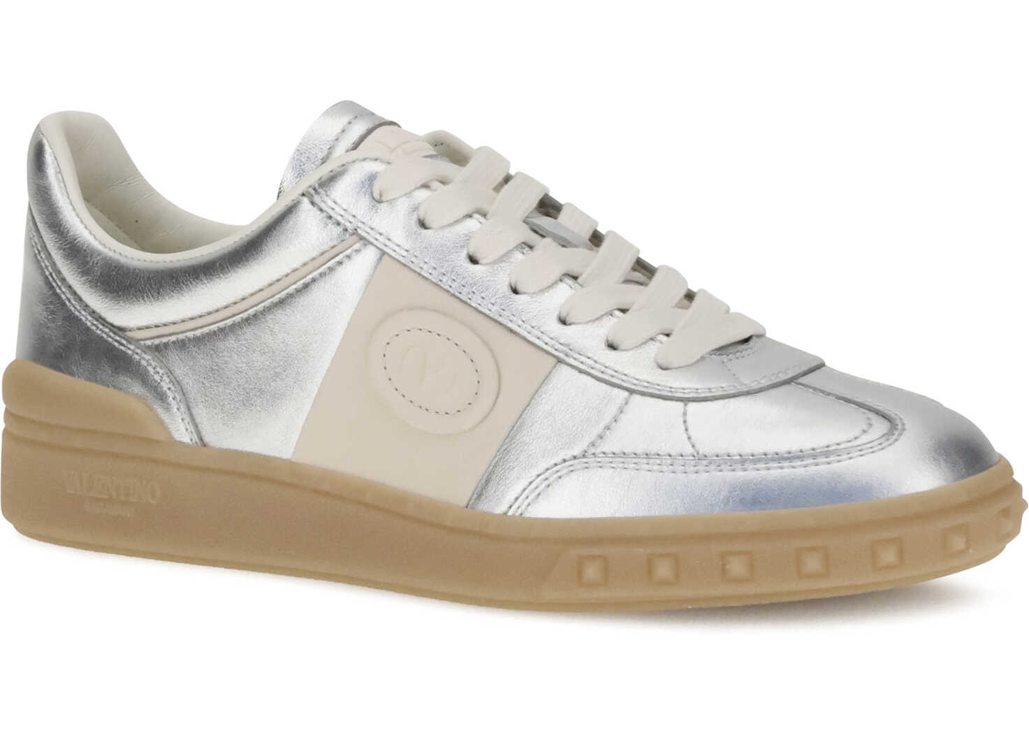 Valentino Garavani's Upvillage Sneakers in laminated calf leather combine light and character in a contemporary silhouette. The tasseled calf leather band creates an elegant contrast, on which the Valentino Garavani logo, also featured on the tongue, stands out. The rubber sole, personalized with the iconic stud detail, completes the design with a gritty and distinctive touch.