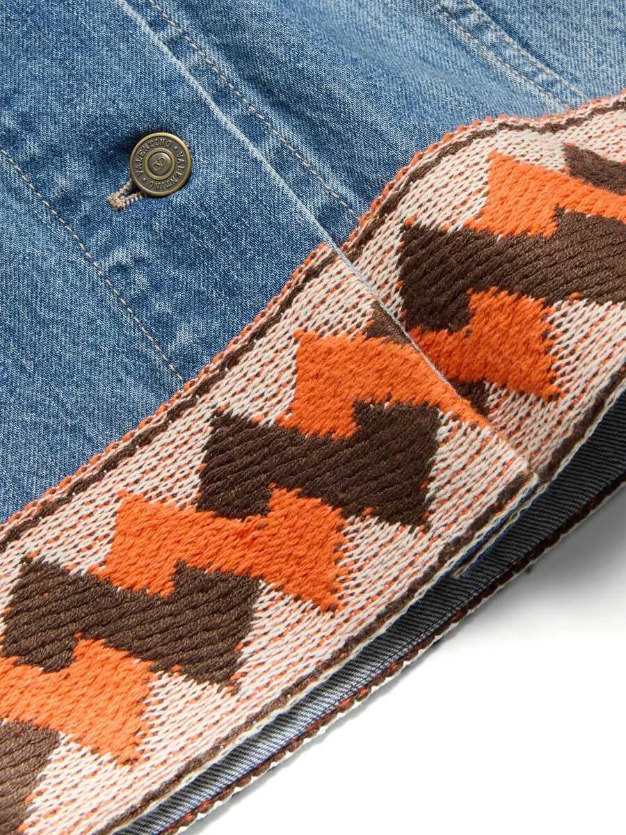 Blue cotton blend denim front button fastening mid-rise two side patch pockets contrasting hem thigh-length