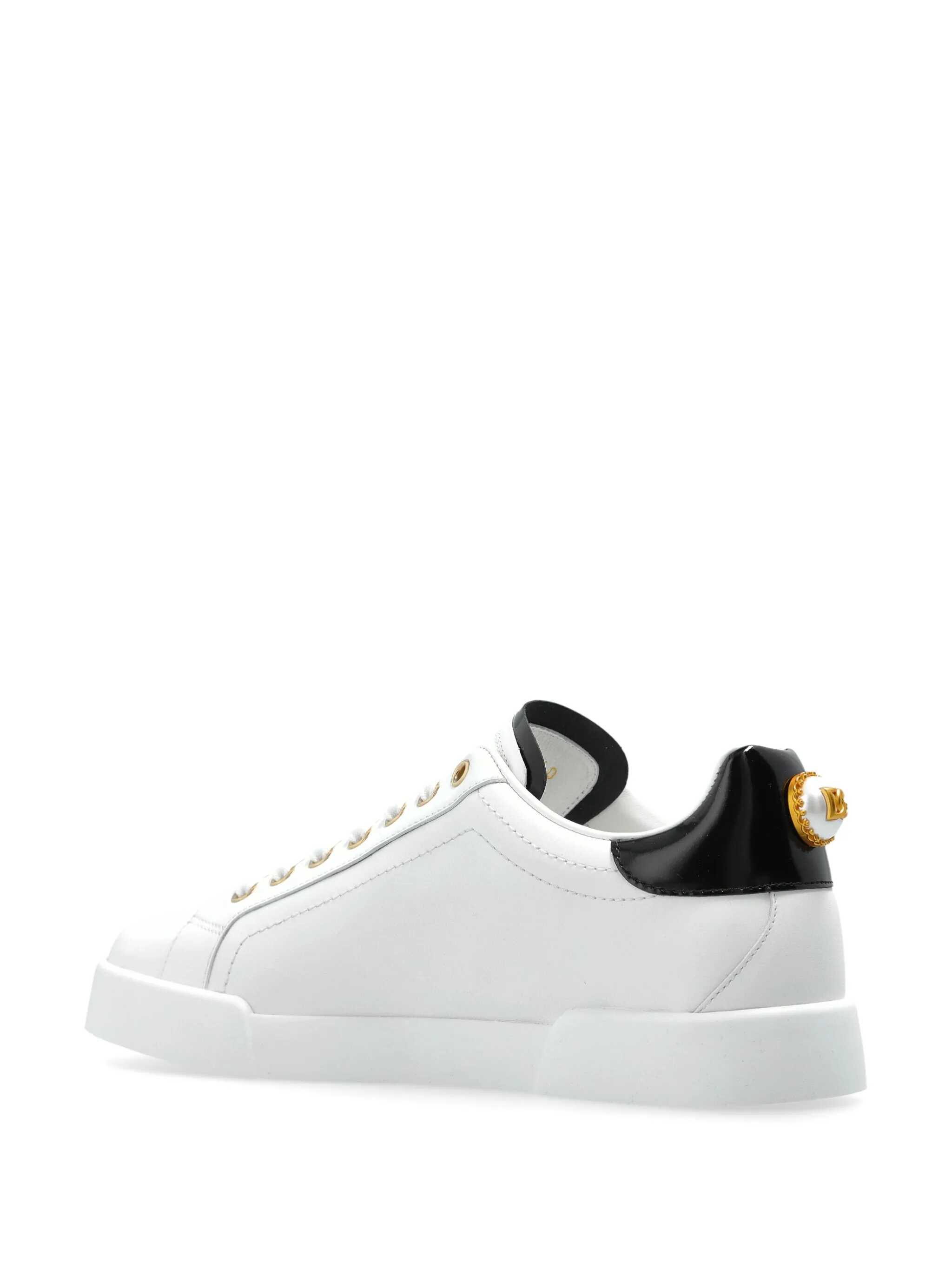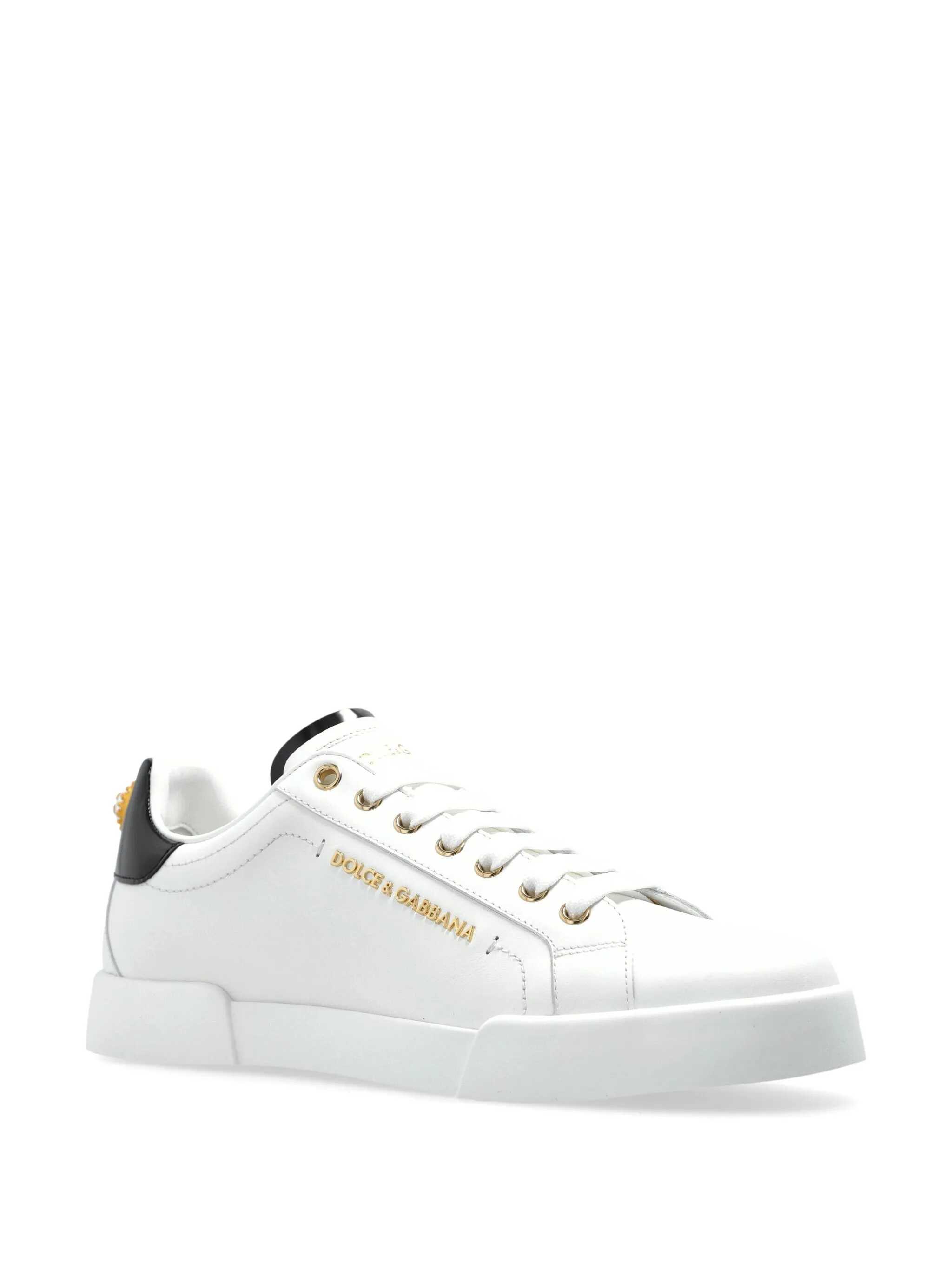 White and black leather sneakers from Dolce & Gabbana featuring round toe, gold tone details, lace-up fastening, lateral printed logo, branded tongue and flat leather sole.