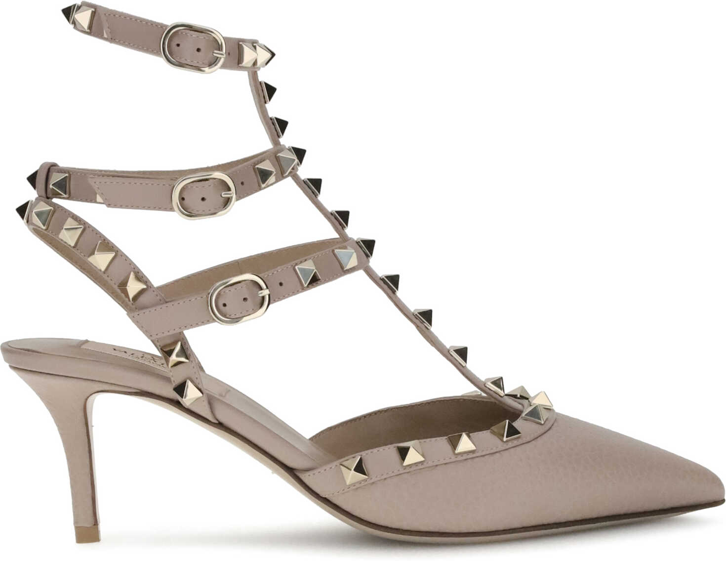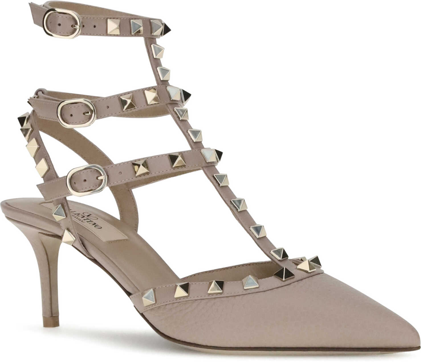 Valentino Garavani's leather Rockstud Pumps express bold and sophisticated elegance. Featuring an elongated geometric toe, they feature an ankle strap with a triple side buckle for a secure and feminine fit. The leather stiletto heel slims the silhouette, while the iconic all-over applied studs give the model a distinctive and gritty character. The design is completed by the logoed insole and the craftsmanship typical of the maison.