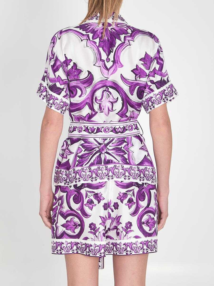 Short-sleeve shirt in white silk twill with a Maiolica print in shades of purple. It features classic notched lapels, front button closure, a patch pocket on the chest, and a matching printed waist belt.
