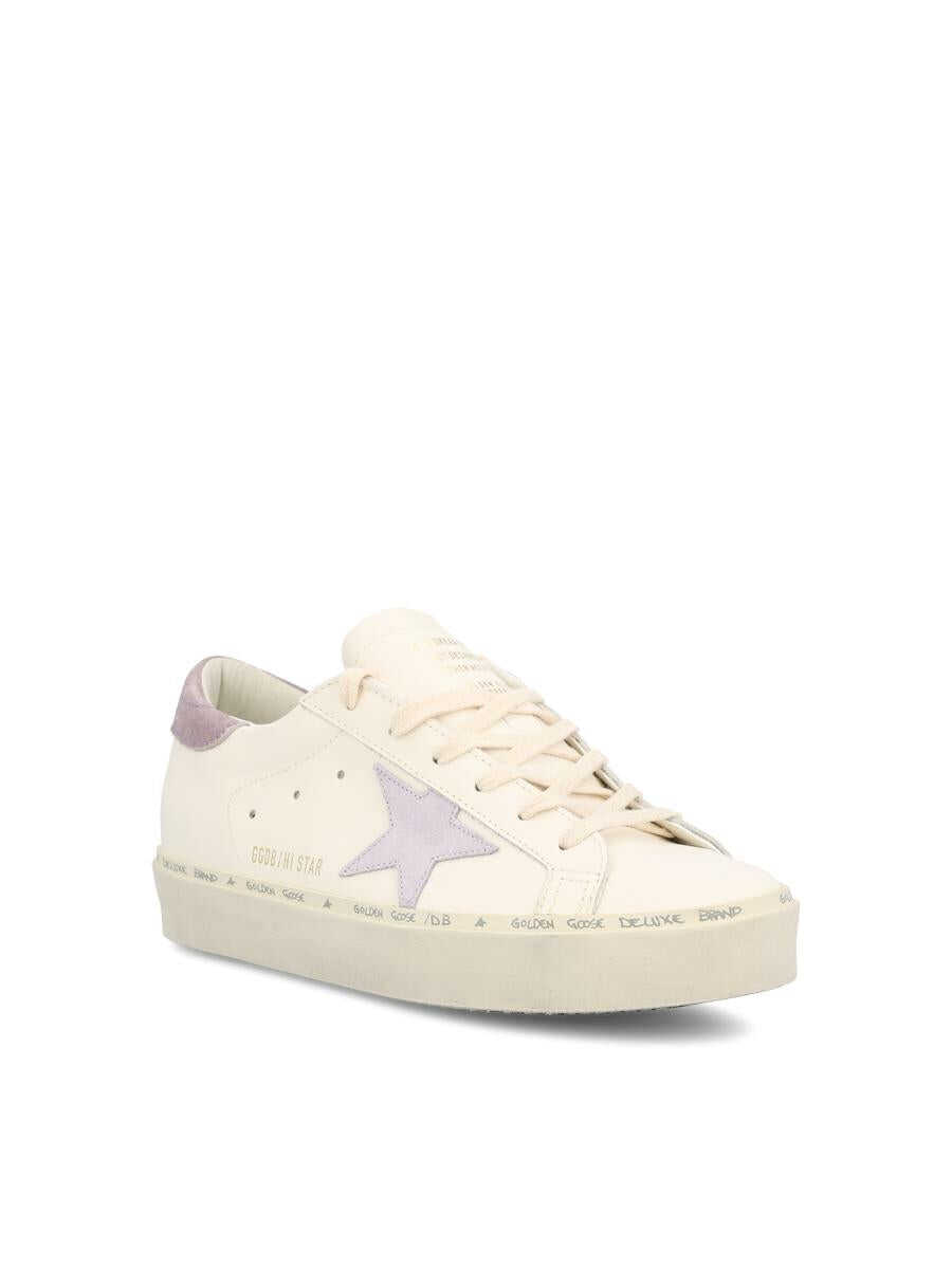 Golden Goose's Hi-Star sneakers elevate the classic low-top model with a high sole and distinctive details. The star and heel add a bright accent to the used-effect design for a balanced mix of Italian craftsmanship and urban style with lived-in appeal. - Upper: 100% leather - Color: white and purple - High rubber sole with used finish and side lettering - Removable ergonomic insole - Textile and terry cloth tongue and lining - Cotton lace-up closure - Leather side star and back heel - Made in Italy - Box included - Item code: GWF00118F00753712280