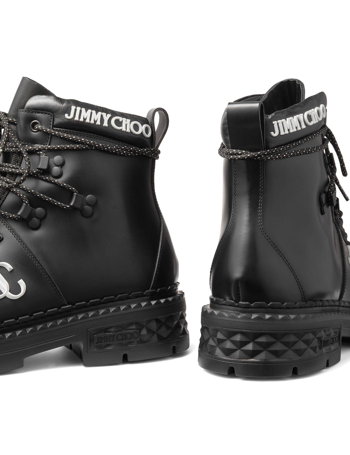 Jimmy Choo hiking boots crafted in leather with embossed and contrasting rubberized JC monogram and lettering logo. Lace-up closure, lightly padded leather interior and rubber sole with Diamond detailing.