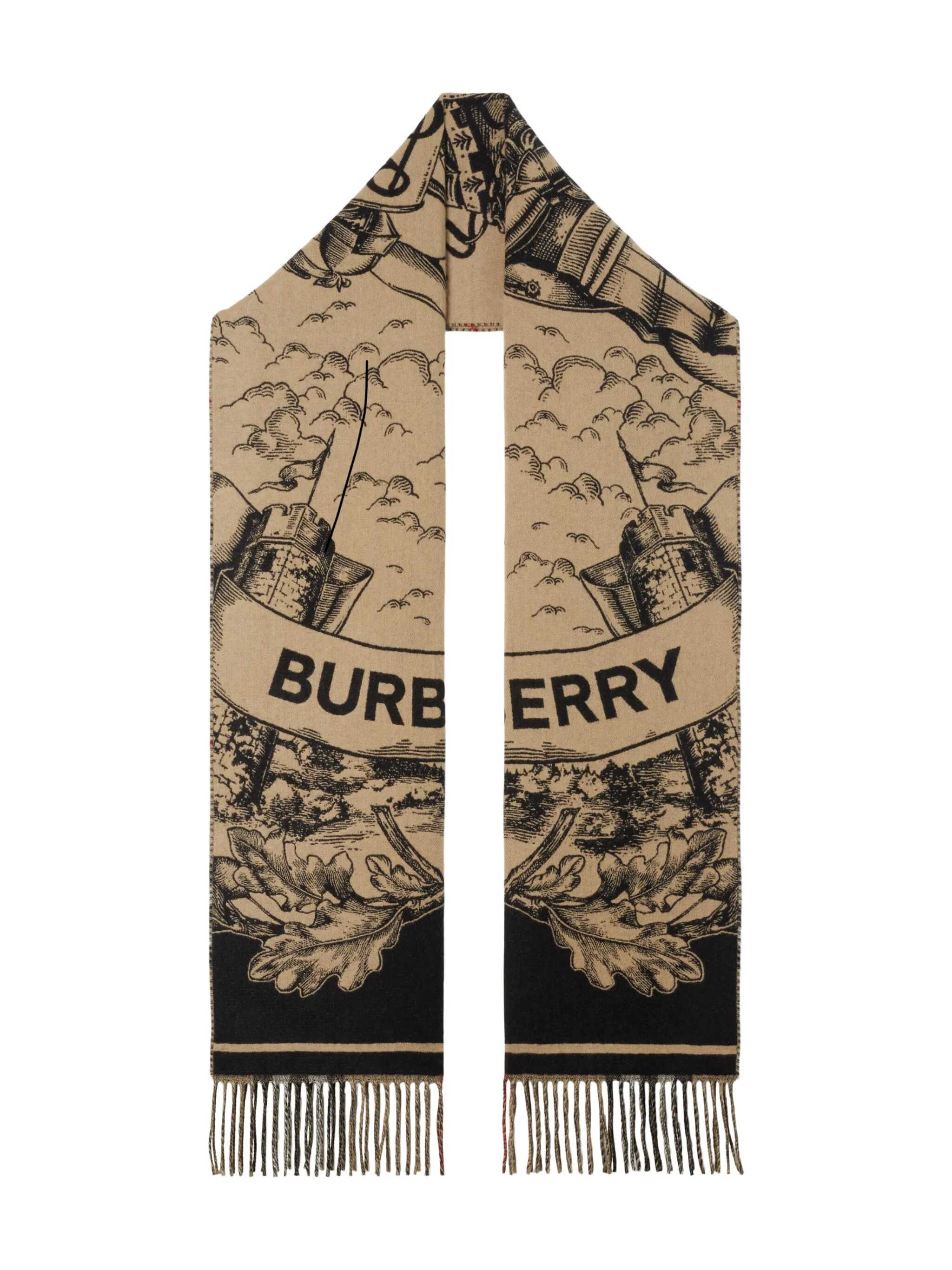Beige and black cashmere scarf from Burberry featuring all-over pattern and fringes.