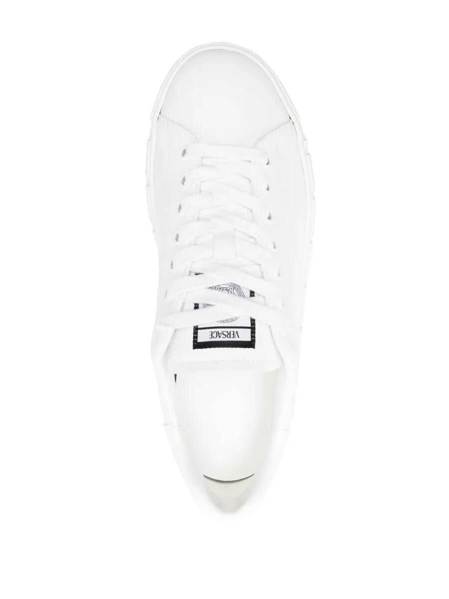 Versace shows off its understated side with these white sneakers. Crafted from soft leather, they have a low silhouette and a Greca embossed midsole. A gold logo adds a finishing touch on the heel.