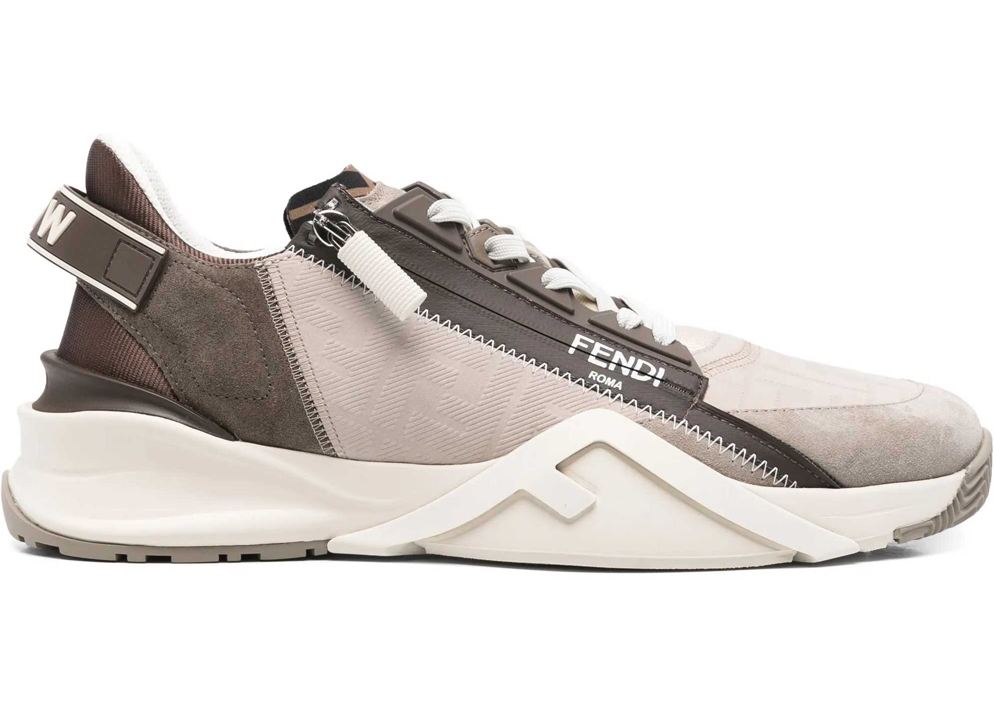The Fendi Flow leather Sneakers are a bold and contemporary model that combines comfort and luxury. With a structured sole, these sneakers offer excellent grip and stability. The elongated toe gives a slender look, while the side panels, decorated with the brand's embossed FF print, emphasize the Fendi identity in an elegant way. The contrasting panel design creates a dynamic look, while the logo press-stud label on the tongue and the zip applied on the instep offer practicality and an additional stylistic detail. The front lace-up closure ensures a comfortable and secure fit, completing the sophisticated design of these sneakers.