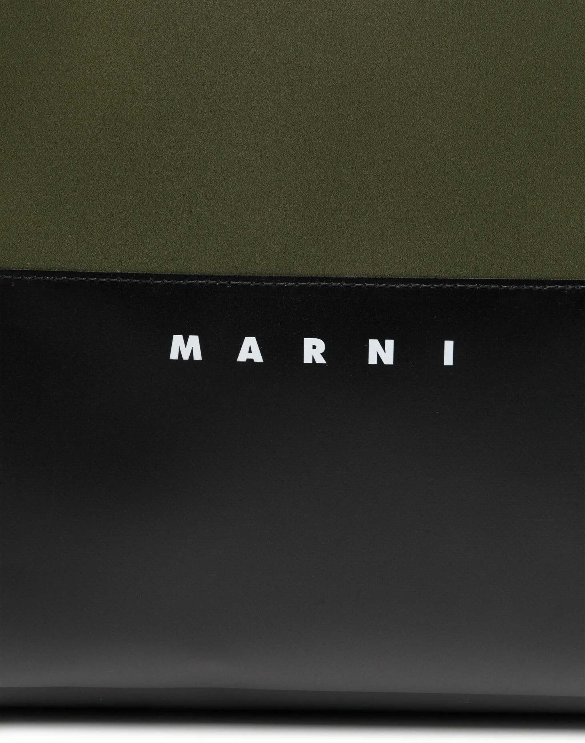 The Tribeca Tote Bag by Marni features two top handles and a large internal compartment, perfect for everyday use. The two-tone panel design gives a modern and decisive touch, while the iconic contrasting monogram on the front adds a distinctive and recognizable note. A practical and original accessory, ideal for completing every look with personality.