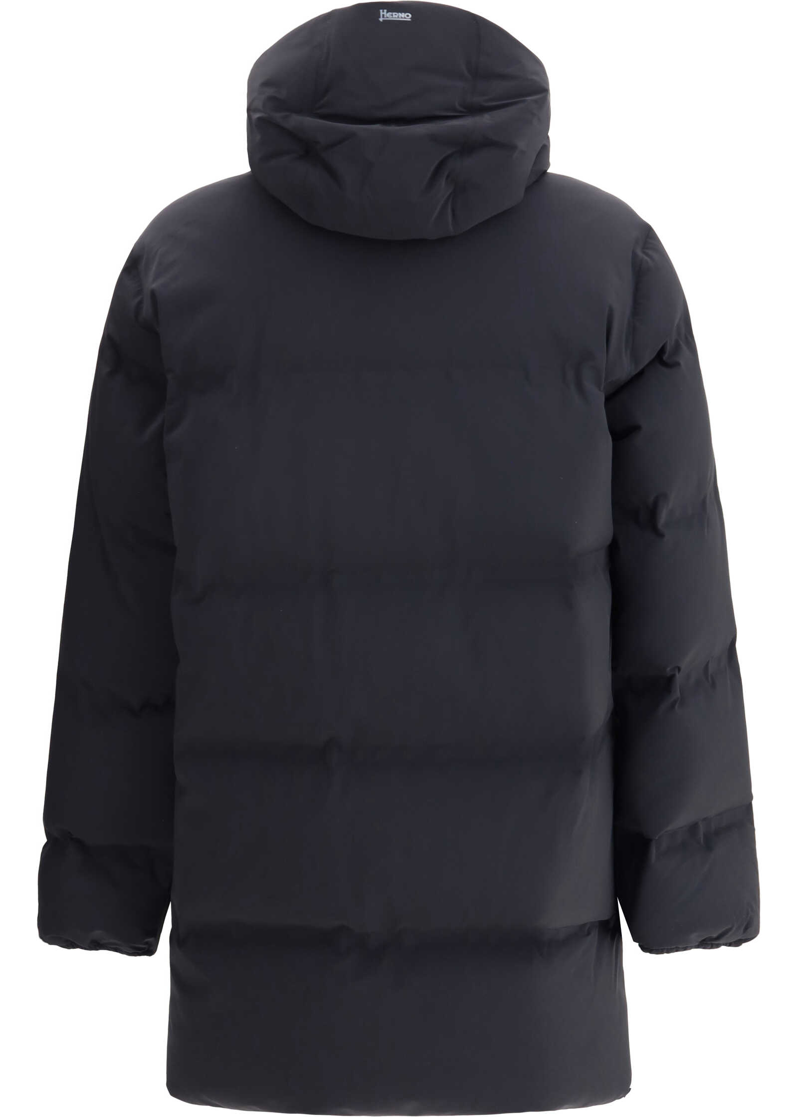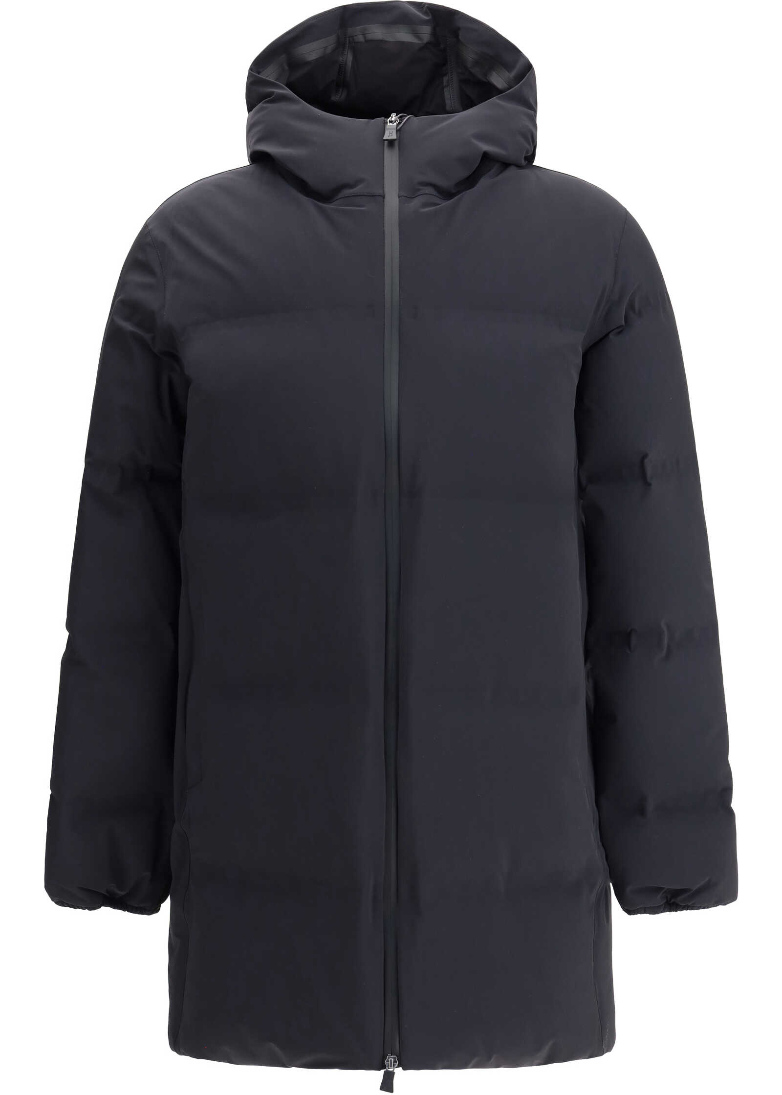 Herno's Down Jacket features a high collar and hooded design for complete protection from the cold. The front closure features a double-slider zipper, while two welt pockets with side zippers provide convenience. Elasticized cuffs ensure comfort, and an adjustable hem with internal drawstring allows for a customized fit. The all-over quilted and padded design ensures warmth and style in every detail.