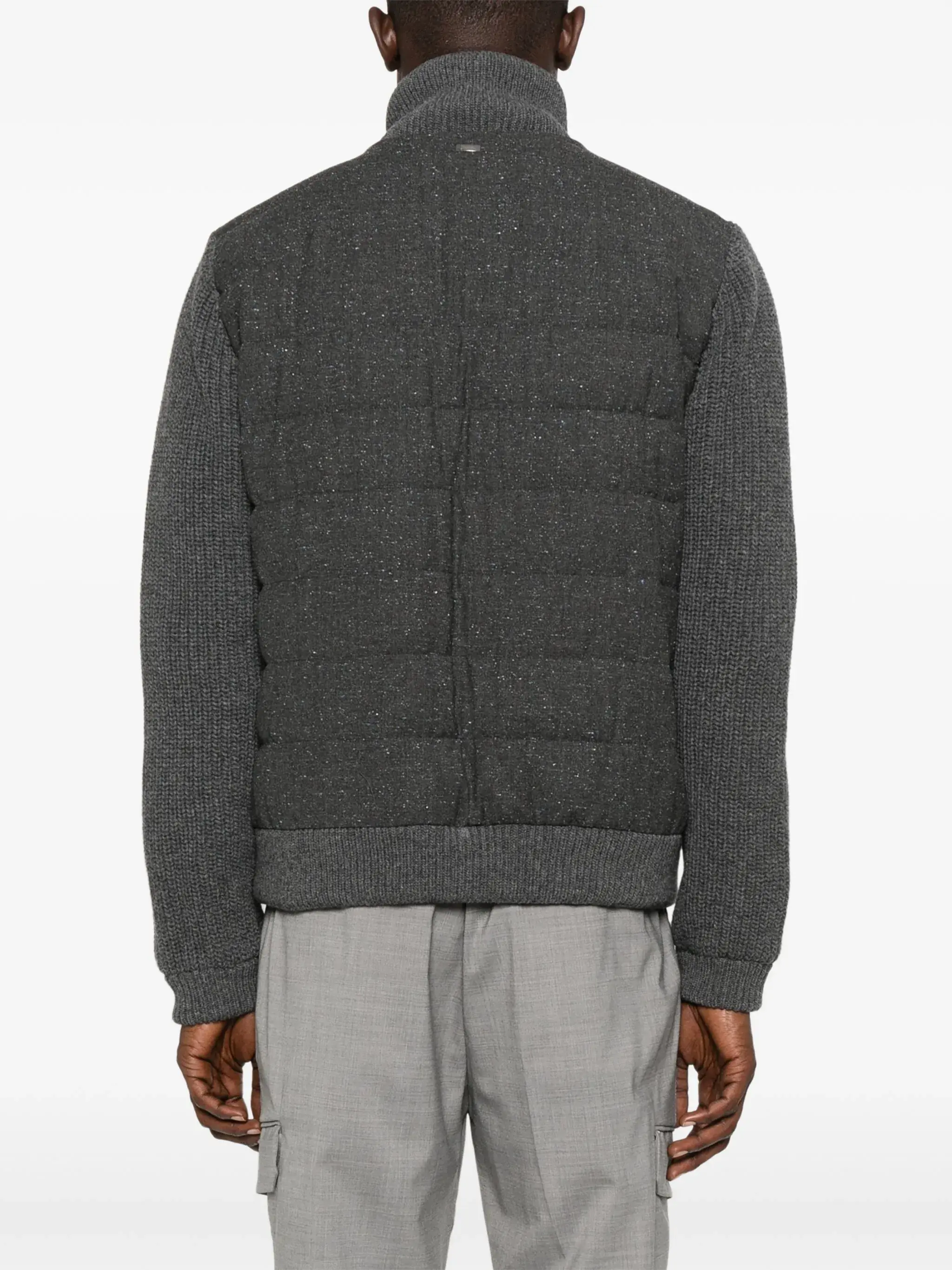 Contemporary-cut Herno bomber Jacket made of soft wool with a mélange pattern. The model features a high collar, a double-slider front zipper closure and two side welt pockets. The ribbed knit sleeves and ribbed hem add a touch of texture and definition to the design. A warm and refined garment ideal for casual yet detail-oriented looks.
