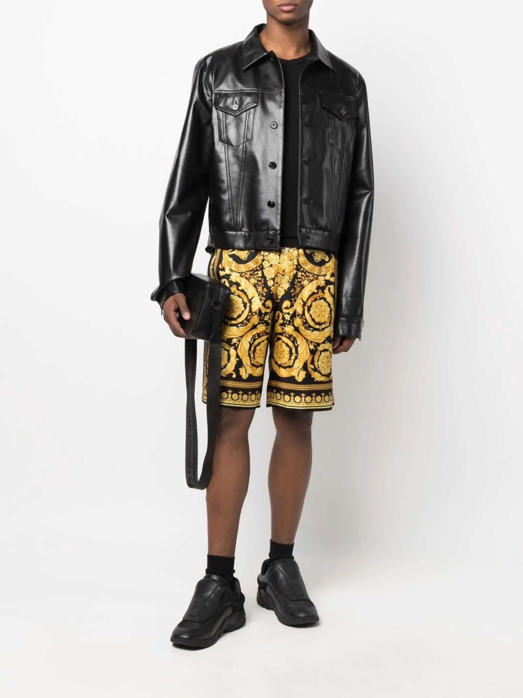 Silk Shorts by Versace featuring the brand's iconic baroque pattern. The model features an elasticized waistband for a comfortable and flexible fit, two side slash pockets and a welt pocket on the back. A lightweight and refined garment perfect for adding a touch of luxury and personality to summer looks.