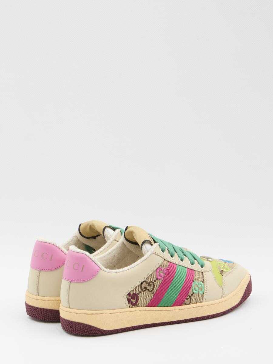 Screener Sneaker with all-over colorful GG embroidery and multicolor fabric. Features a round toe, leather lining, enameled oval detail with metal Double G, vintage Gucci logo label on the tongue, lace-up fastening, pink leather heel tab with embossed Gucci logo, two-tone rubber sole, and low heel. Dust bag included. Additional laces included. Any irregularities in the leather are inherent characteristics of the material and should not be considered manufacturing defects.