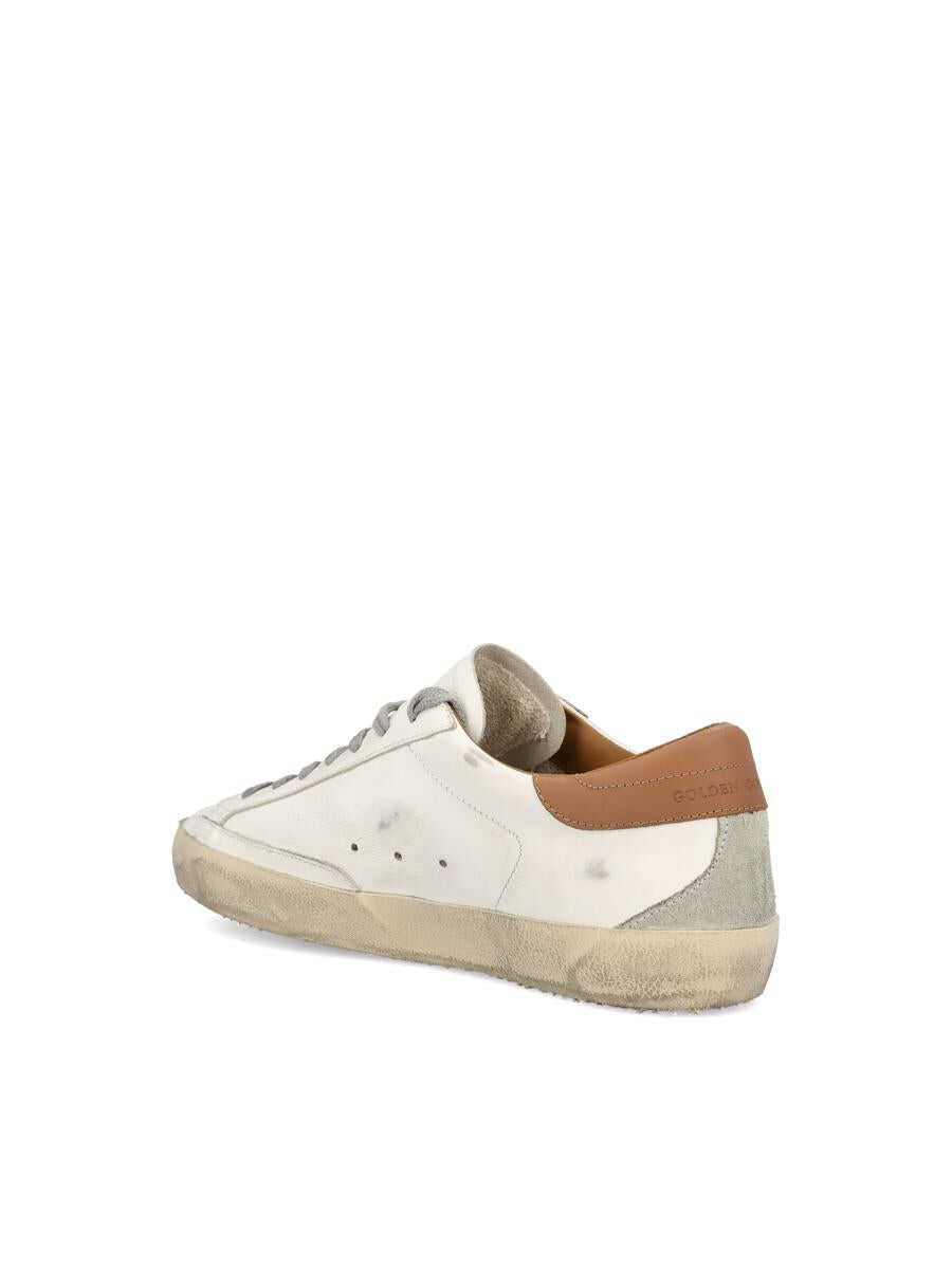 Golden Goose's Super-Star sneakers stand out for their unmistakable style, inspired by the skate world and reinterpreted with Italian craftsmanship. This model combines white leather, beige suede star and brown heel in a lived-in, authentic aesthetic that symbolizes the brand's DNA. - Upper: 100% cowhide leather - Color: white - Lining: 50% cowhide, 40% cotton, 9% polyester, 1% polyurethane textile - Sole: 100% rubber - Ice gray suede star - Light brown leather heel - Ice gray suede insert on back - Vintage treatment - Made in Italy - Box included - Item code: GMF00102F00218210803