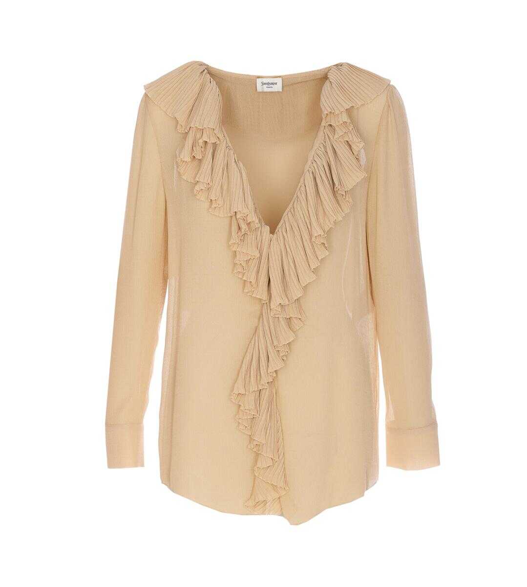 Saint Laurent Beige Mousseline Shirt, Buttons Closure, V-Neck, Long Sleeves, Buttons On Cuffs, Rouches, EU SIZE (FR)
