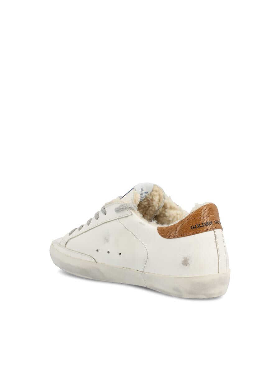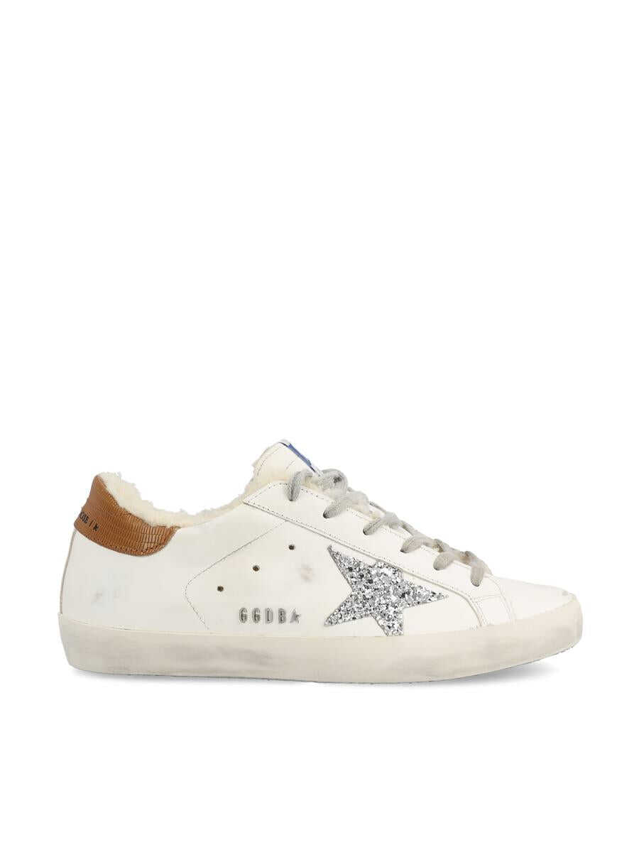 Golden Goose's Super-Star sneakers with shearling lining combine thermal comfort and brilliant style. Made of white leather with used-effect details, they are embellished with a silver glitter star and designed for those who won't give up elegance even on the coldest days. - Upper: 93% cowhide, 4% sheepskin, 2% polyethylene terephthalate, 1% cotton - Color: white - Lining: 63% sheepskin, 37% cowhide - Silver electroplated metal GGDB lettering - Ice gray colored laces - Silver glitter star - Dove-colored lizard print leather heel - Vintage treatment - Made in Italy - Box included - Item code: GWF00101F00269510942