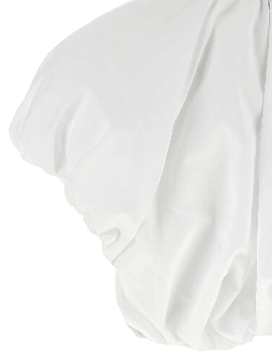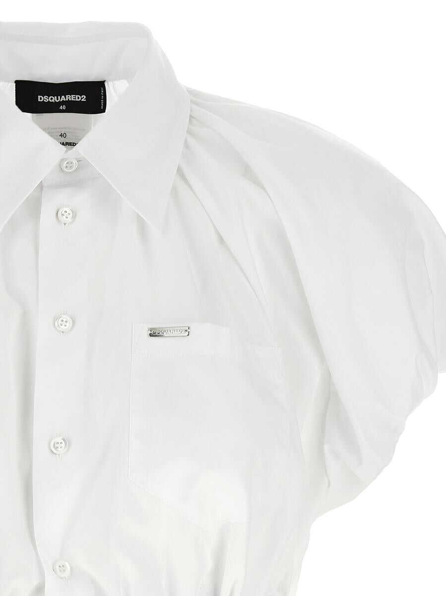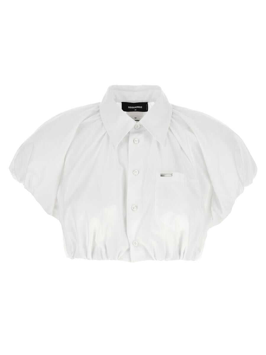 Cotton shirt, crop model, classy collar, metal logo application on the pocket, curled on the bottom and sleeves, front button closure