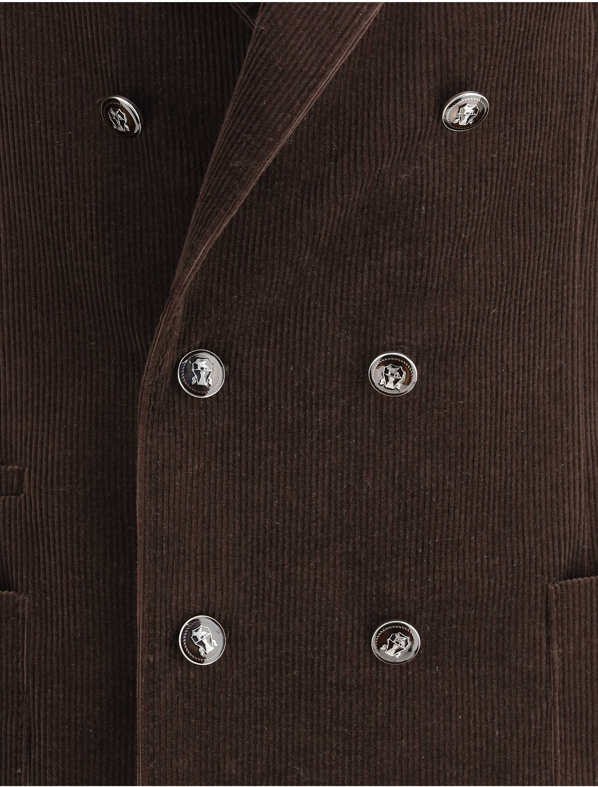 Brunello Cucinelli's wool Blazer Jacket is a sophisticated piece, featuring a ribbed velvet design that lends a refined texture. The peaked lapels add a touch of elegance, while the double-breasted front button closure with grooved buttons recalls a classic, high-quality style. The two patch welt pockets and slit pocket on the front offer practicality without sacrificing style. The two slits at the back ensure a comfortable fit and excellent freedom of movement.