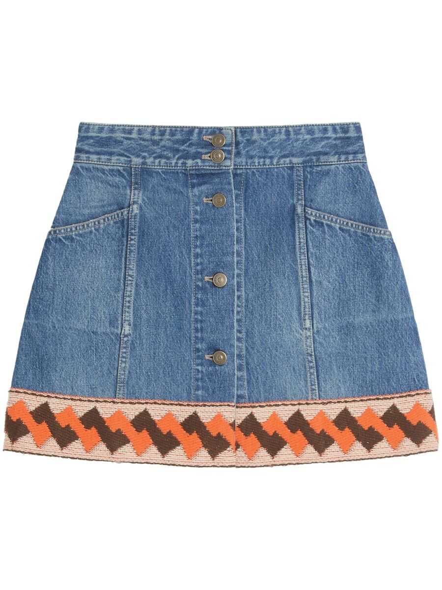 Blue cotton blend denim front button fastening mid-rise two side patch pockets contrasting hem thigh-length