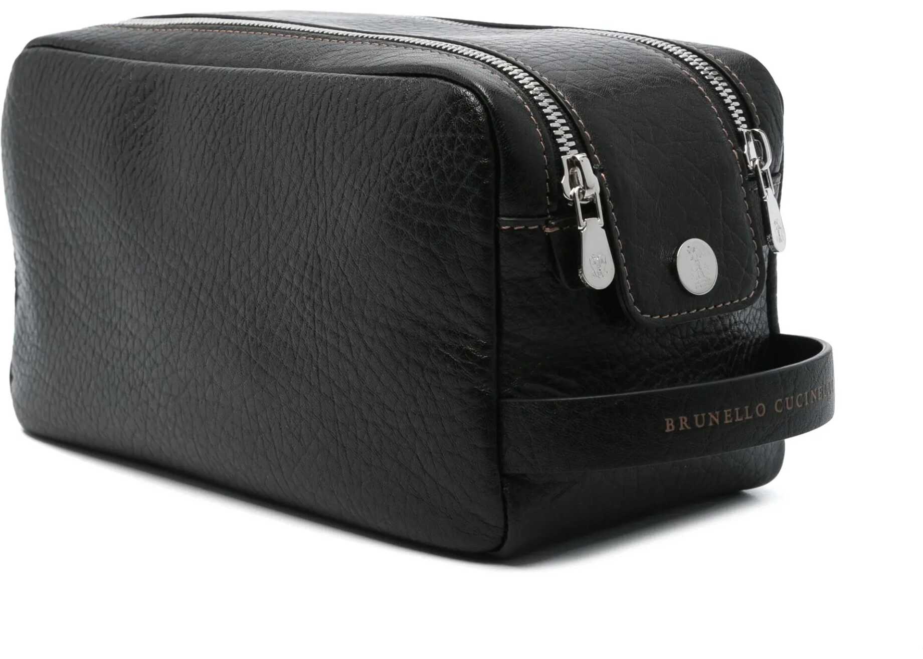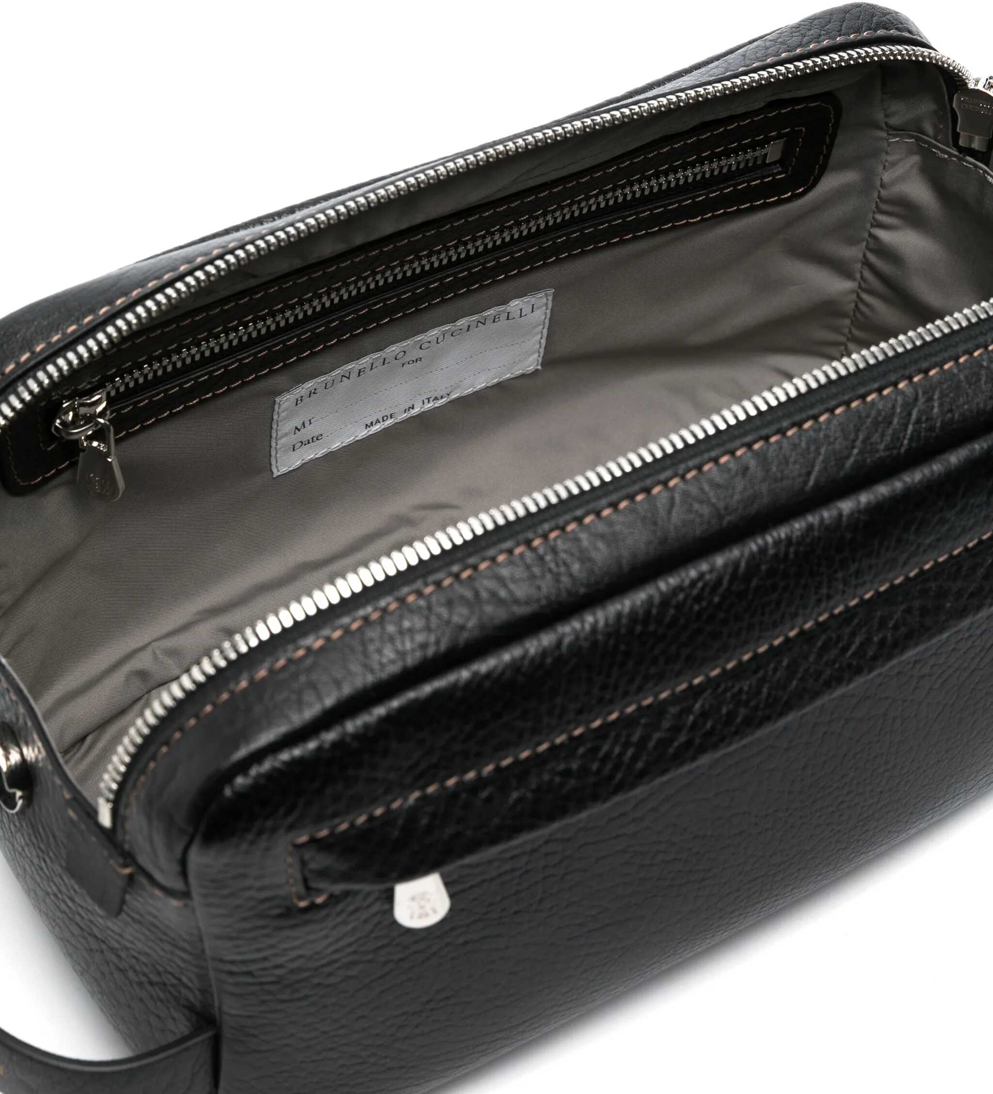 Brunello Cucinelli's grained leather Beauty Case combines sophistication and functionality in a compact and elegant accessory. Made of high-quality leather, it features a double top zipper for convenient and full opening. The side pull, positioned on the panel, makes it easy to carry and adds a distinctive touch to the essential design.