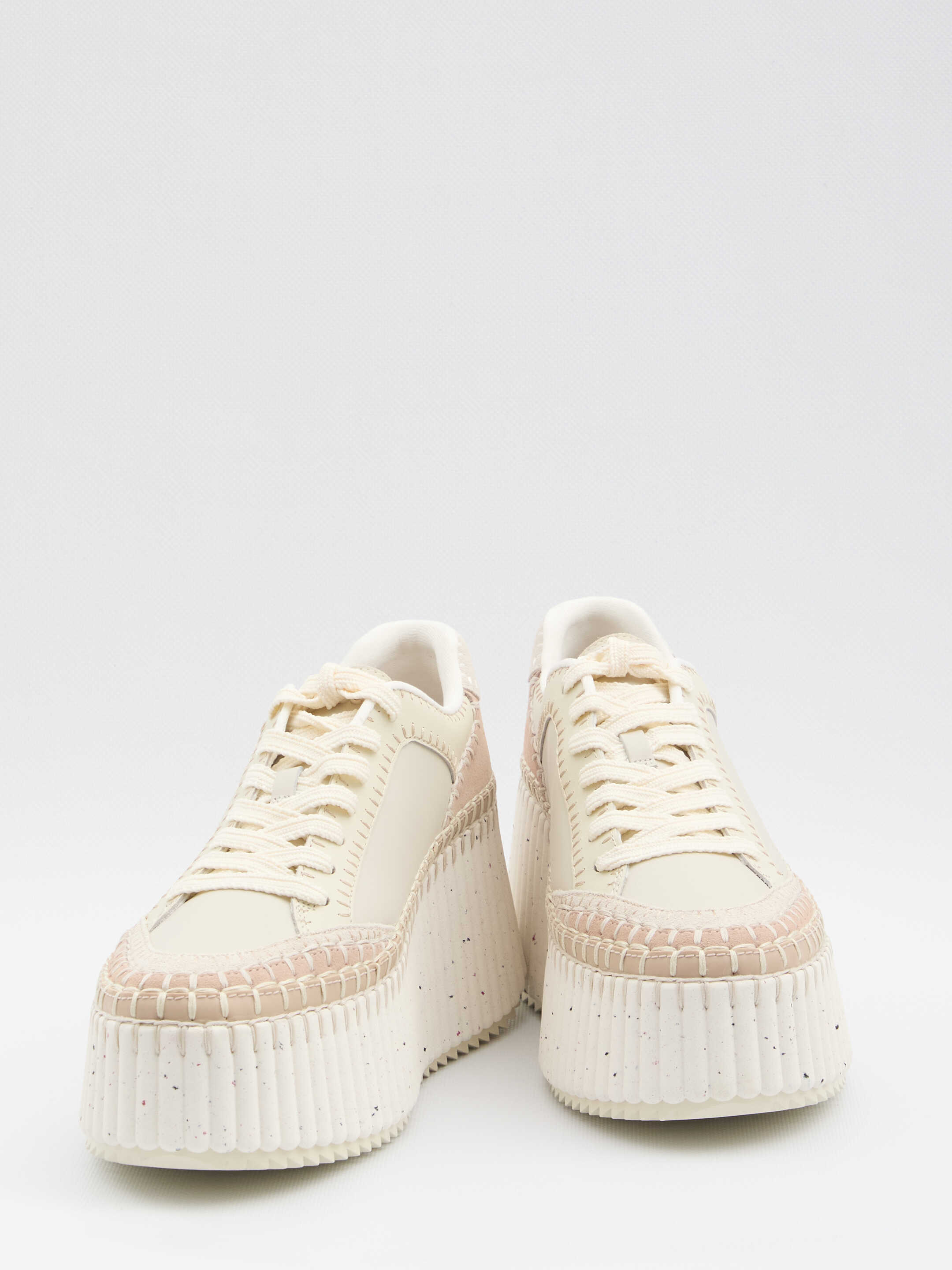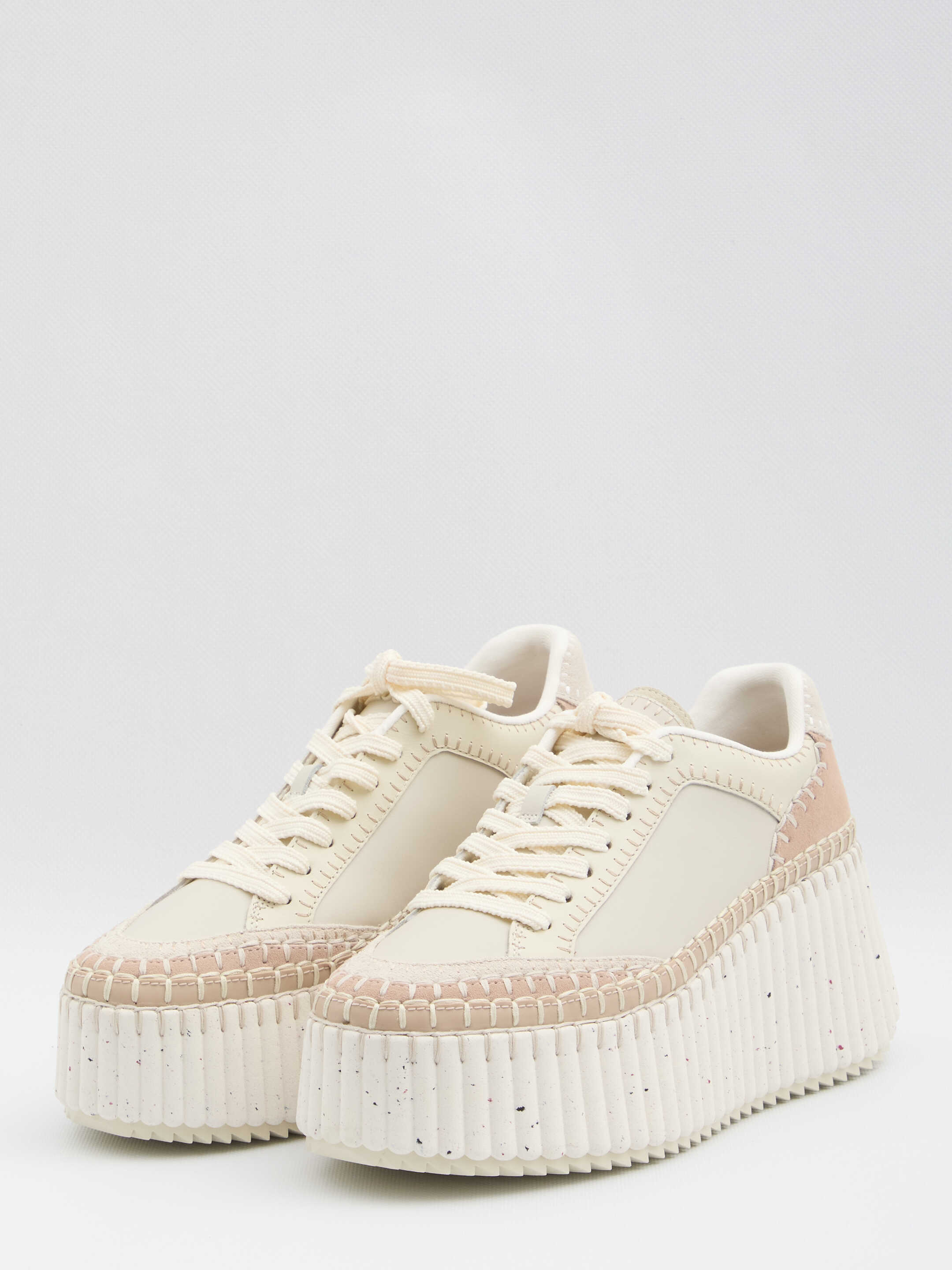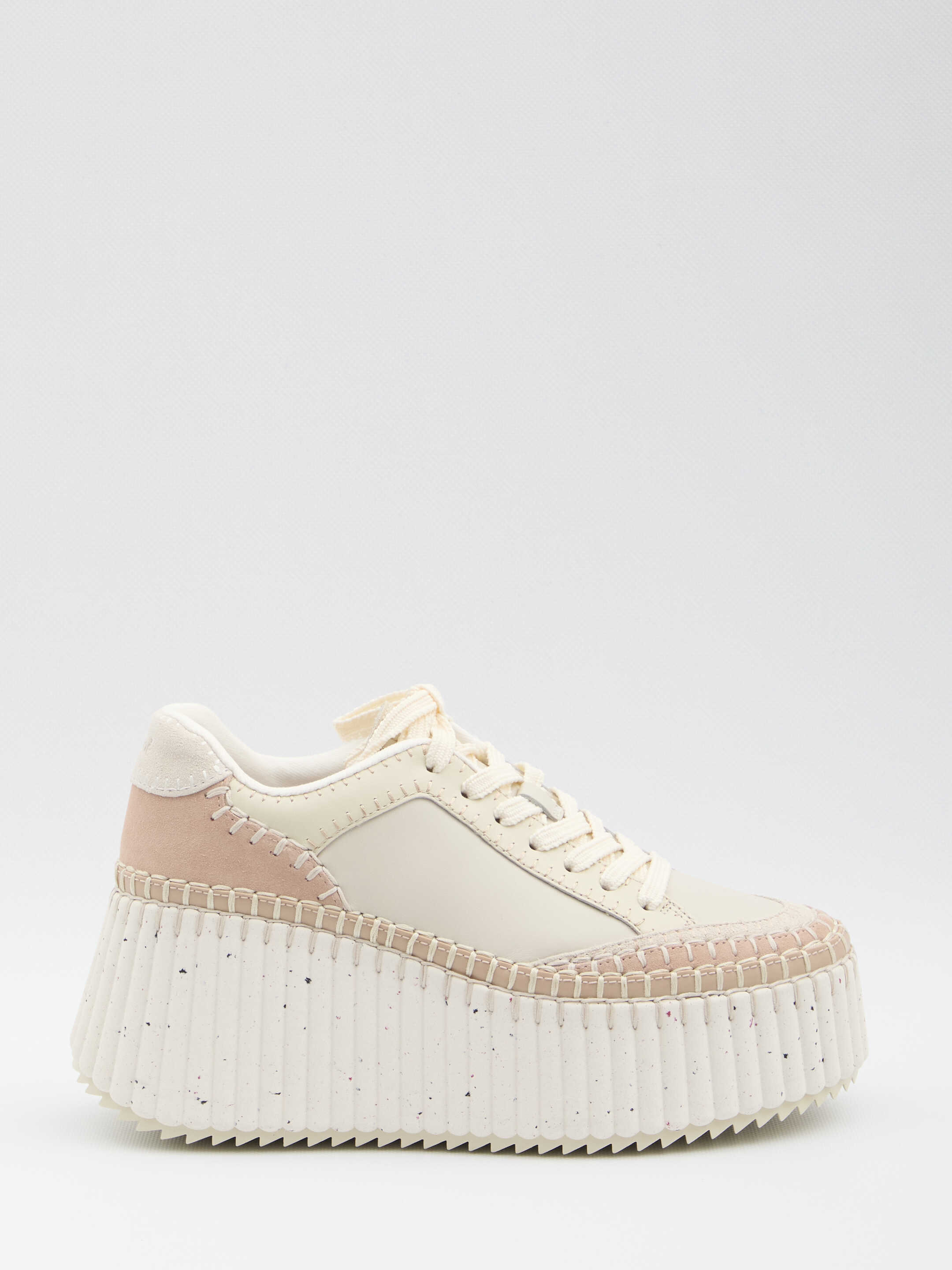 Nama wedge sneakers in smooth and suede calfskin in “Tan Rose” color. Featuring hand-stitched detailing, ribbed wedge structure, laces, and embossed Chloé logo on the back. Dust bag included. Any irregularities in the leather are not to be considered defects, but rather a characteristic of the material.