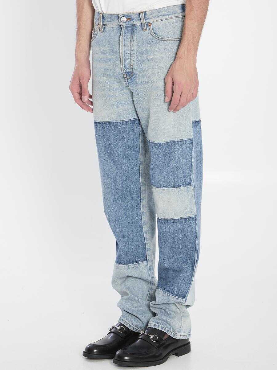 Denim Pants featuring a patchwork design with contrast inserts. They come with multiple pockets and a front button and zip closure.