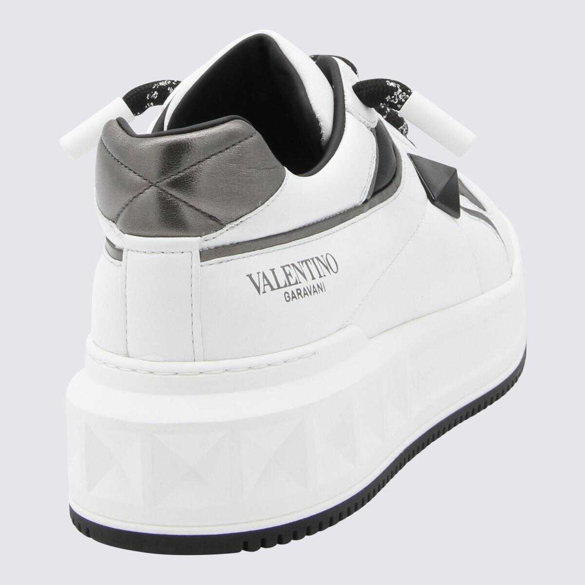 White and black leather sneakers from Valentino Garavani featuring round toe, laces fastening, studs detail and leather sole.