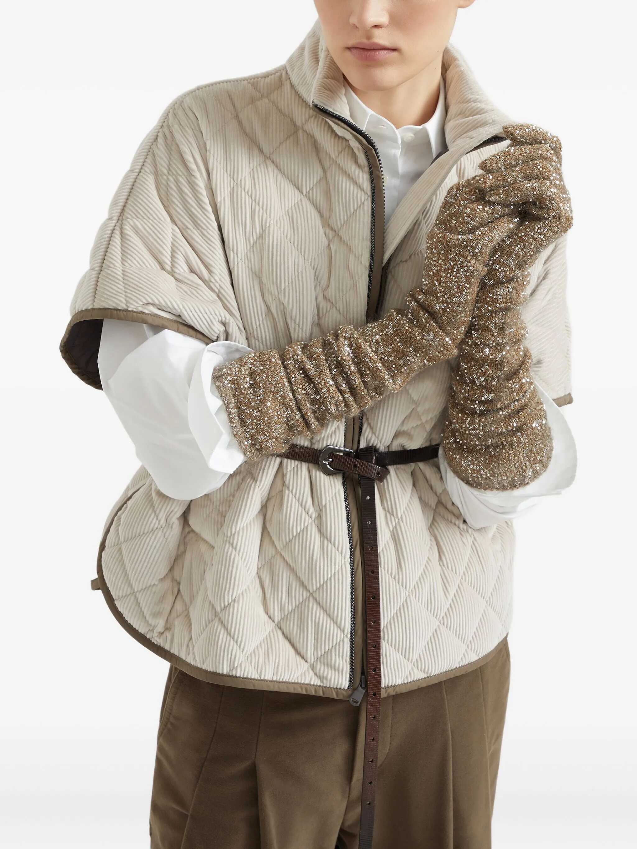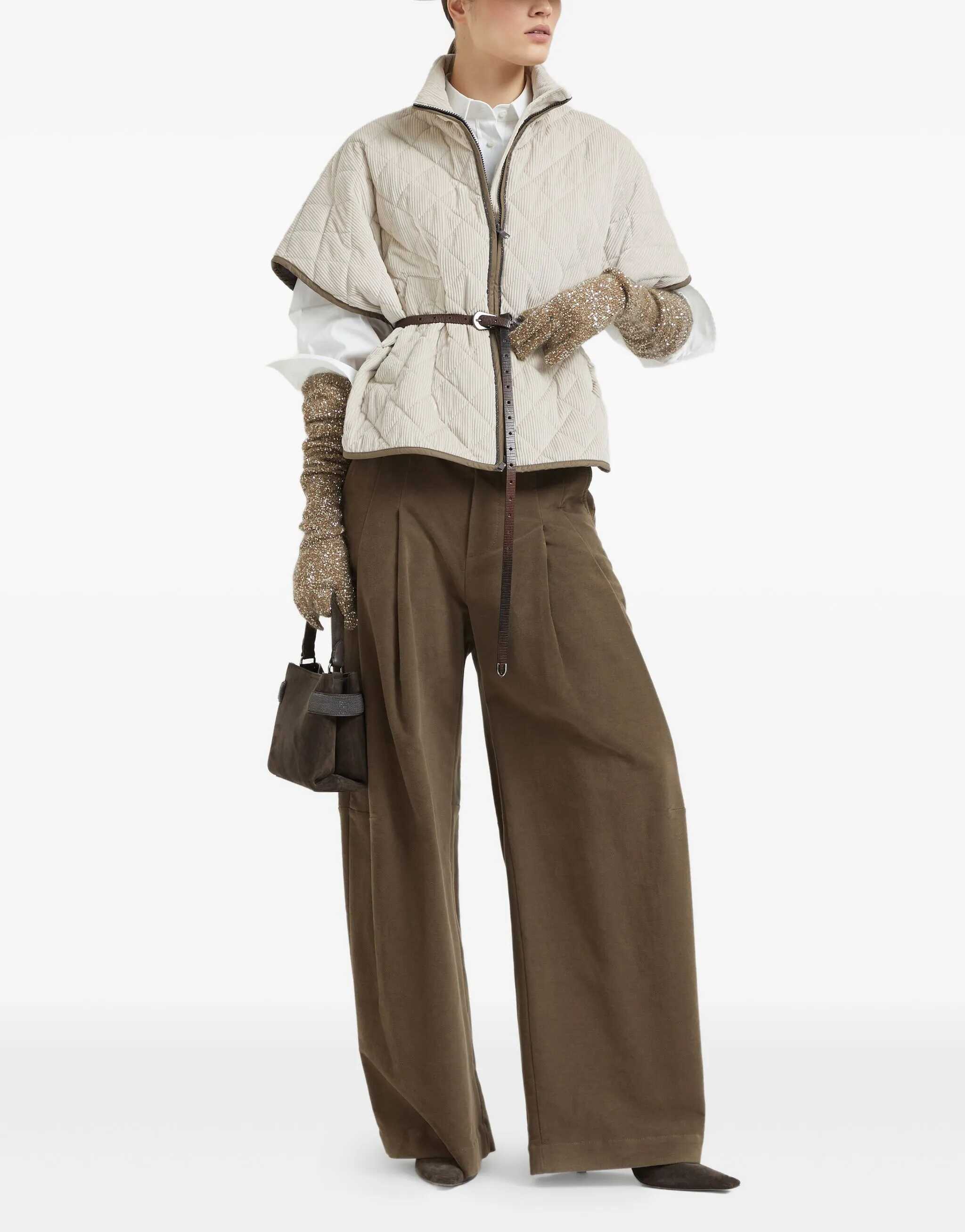 Brunello Cucinelli's Corduroy quilted Jacket combines fine materials such as cotton and cashmere with refined country inspiration. The short, wide sleeves are ideal for creating elegant overlays, while the front zipper closure completes the design with practicality and style.
