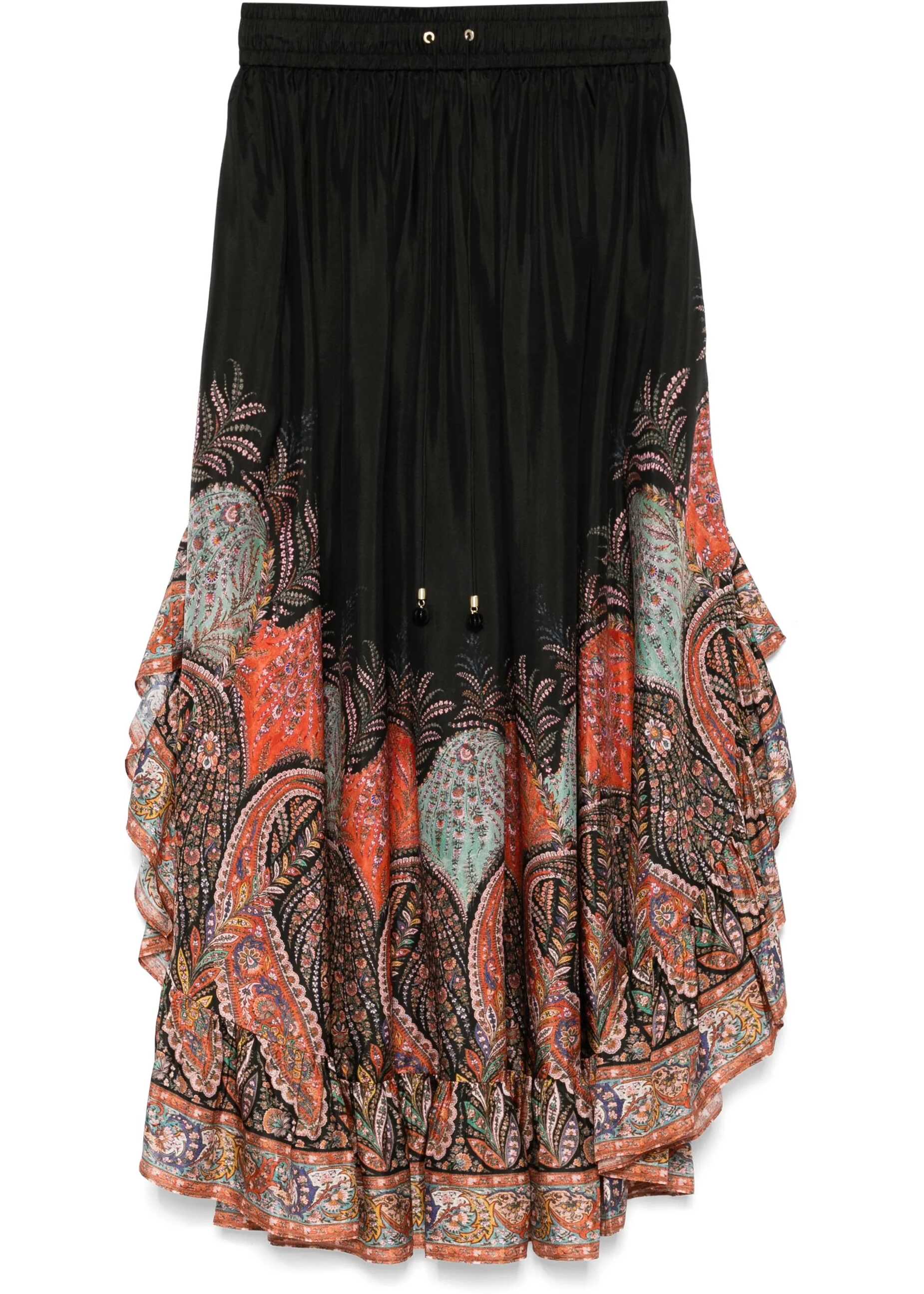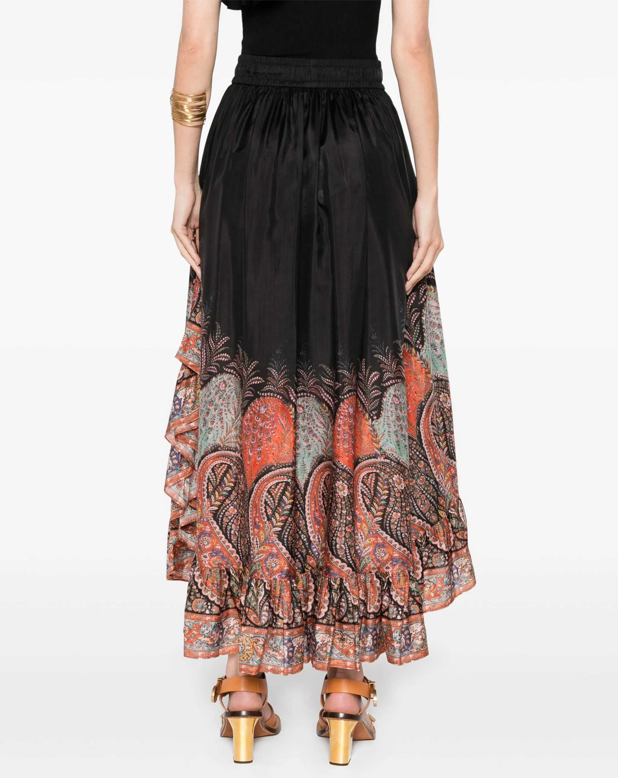 Rhiannon Ruffle maxi skirt in black Paisley habutai silk. Featuring a gathered waist with a thin drawstring, side seam pockets, and a ruffled hem.