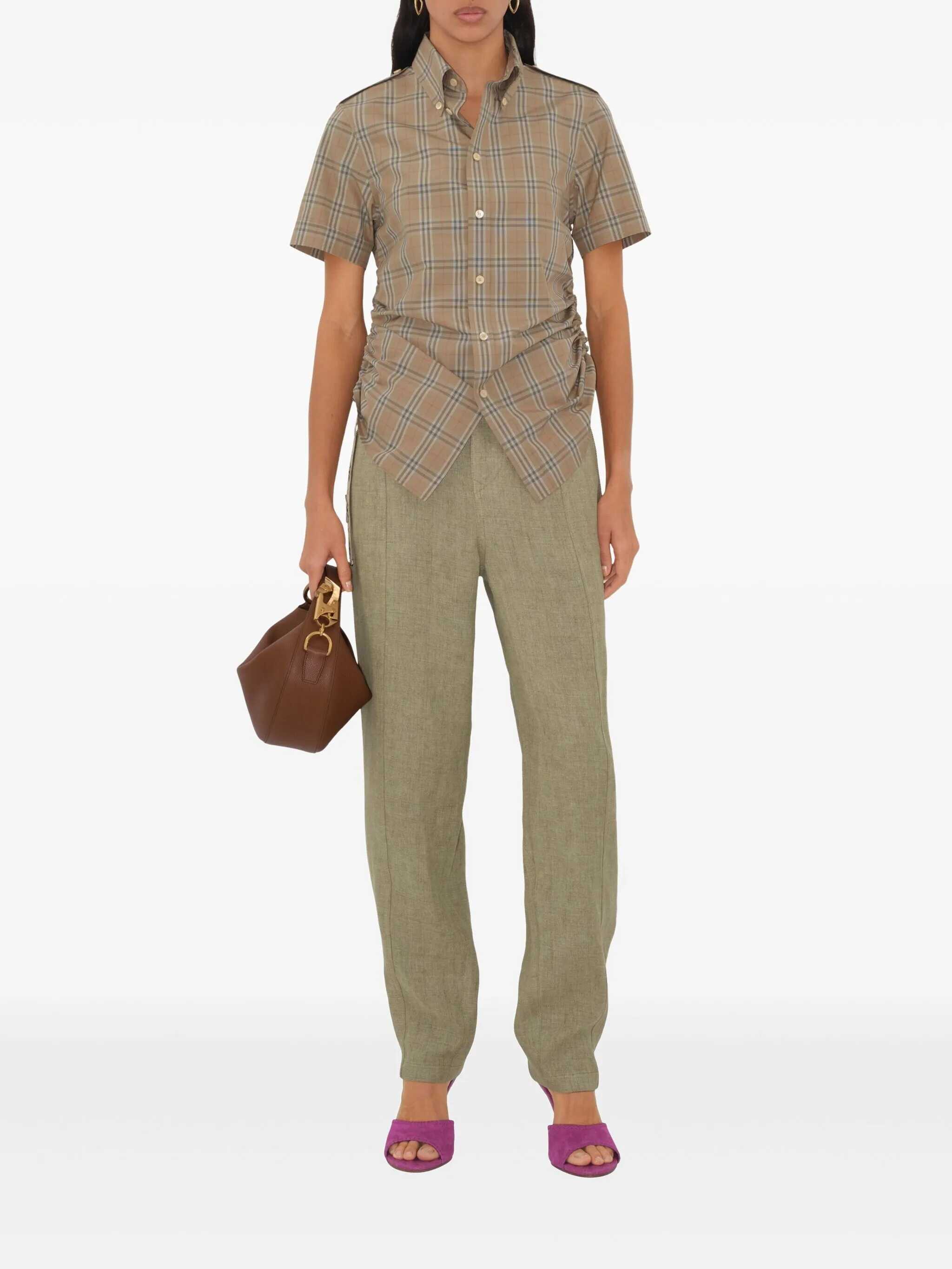 Burberry shirt made of dark beige cotton poplin with a check print. Featuring a button-down collar, front button closure, short sleeves, shoulder epaulettes, and a rounded hem. The design is completed with adjustable side gathers featuring Burberry Check straps and B-shaped buckles.