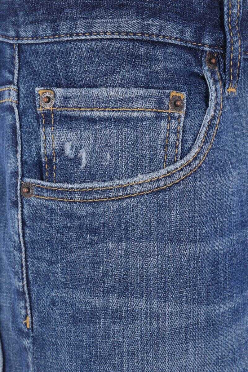 Dsquared2 jeans crafted from blue stretch cotton denim with a distressed finish. Featuring a metal button closure, belt loops, five classic pockets, and a logo patch on the back.