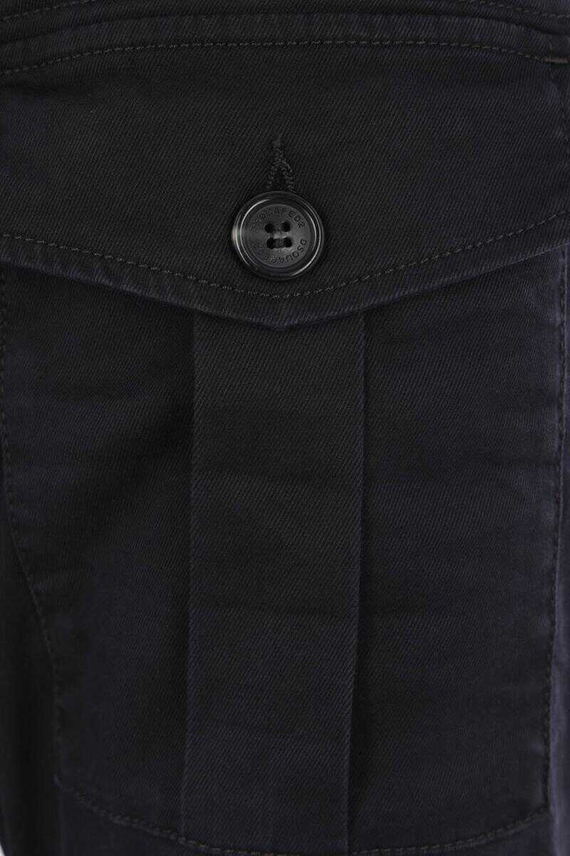 DSquared2 cargo trousers crafted from black stretch cotton gabardine. Featuring a front button closure, belt loops, multiple pockets, and a metal logo plaque on the back.