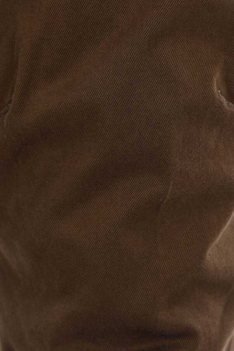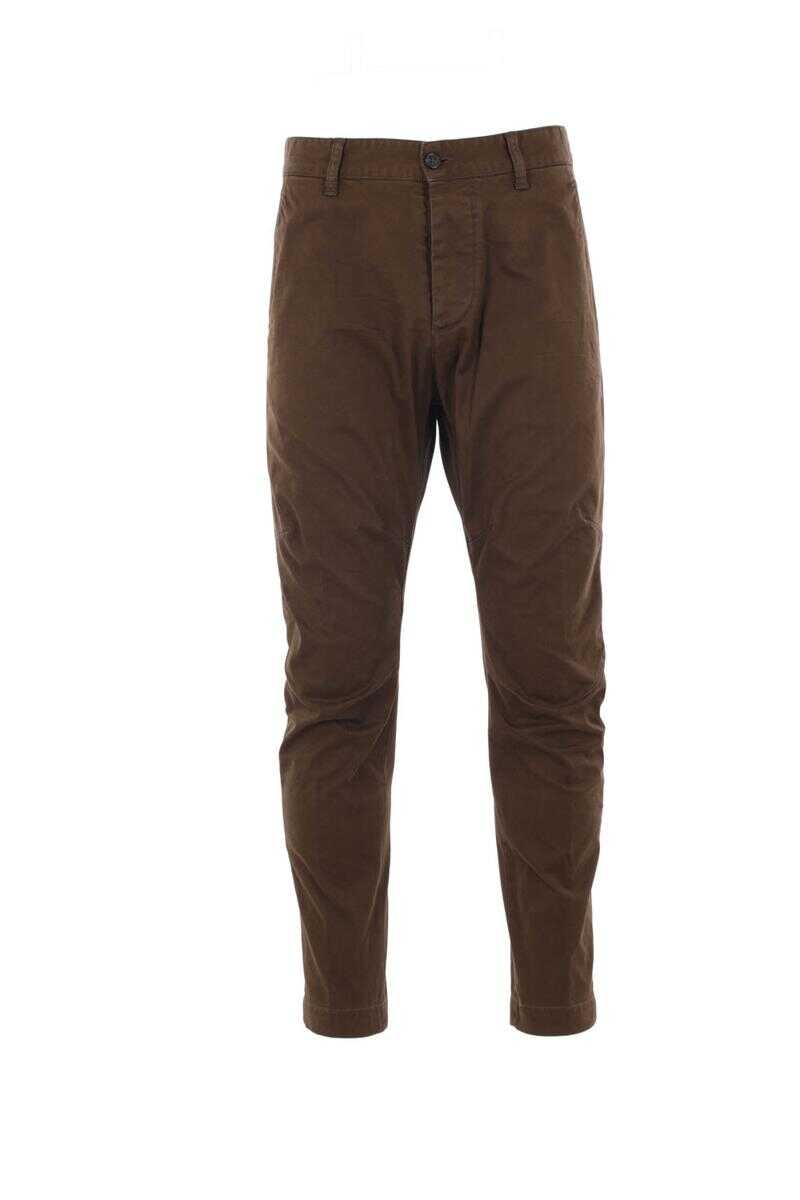 DSquared2 chino trousers crafted from military green stretch cotton gabardine. Featuring a front button closure, belt loops, multiple pockets, and a metal logo plaque on the back.