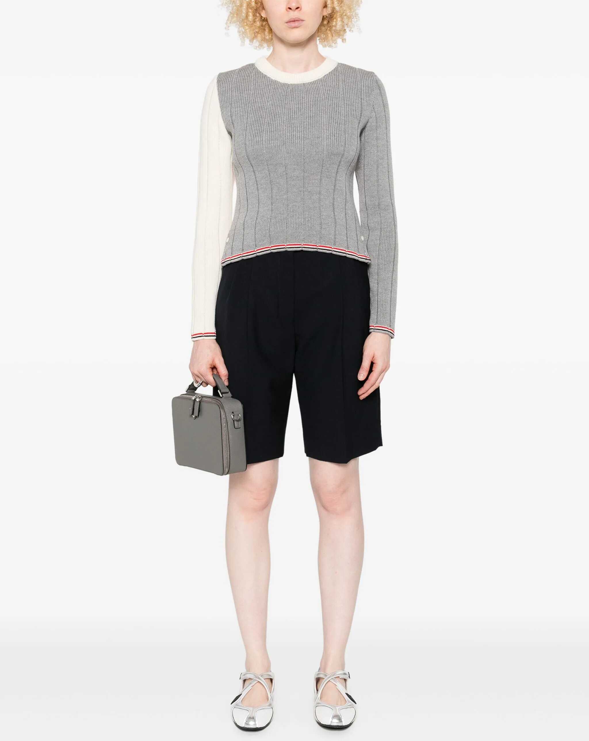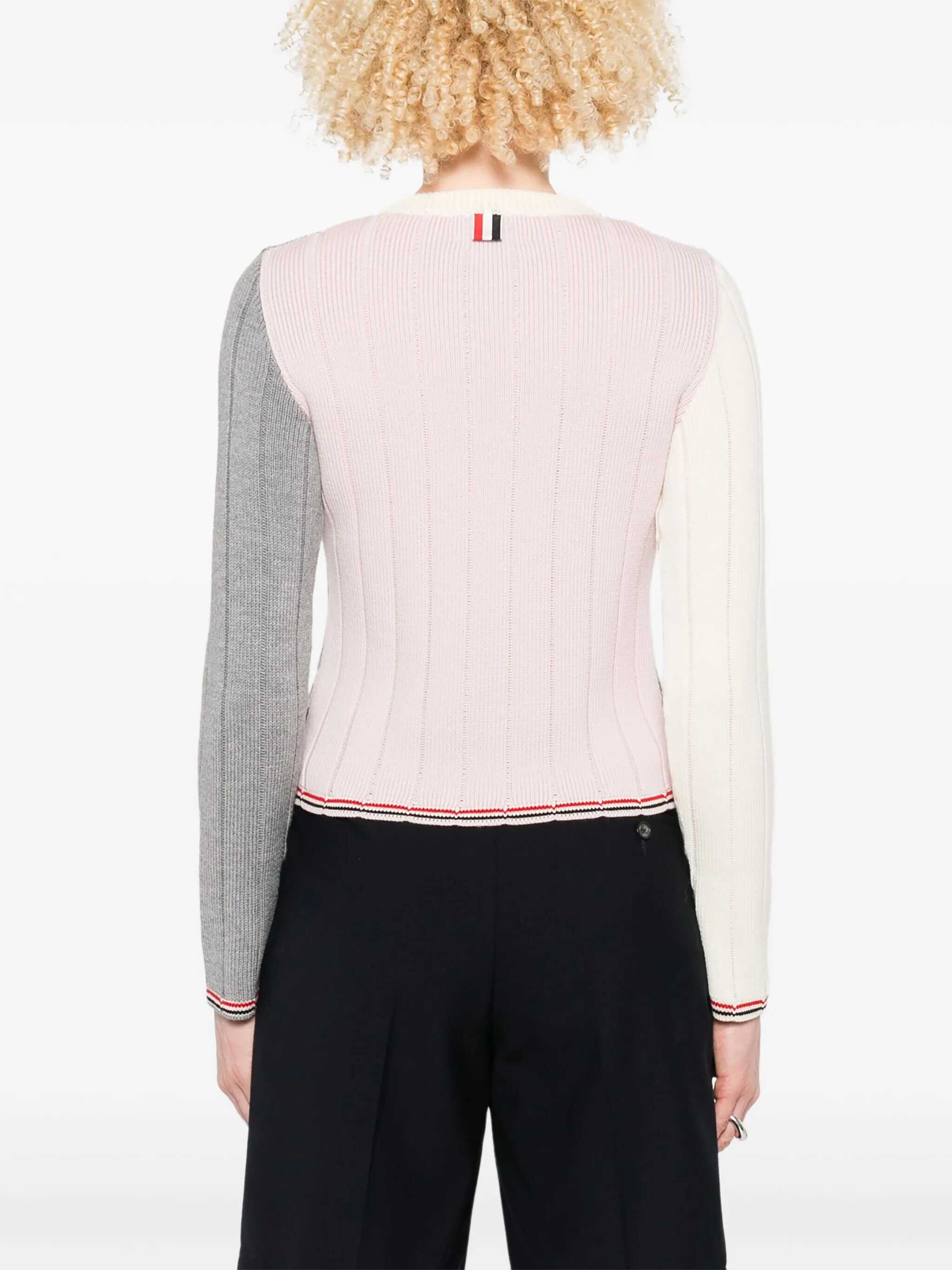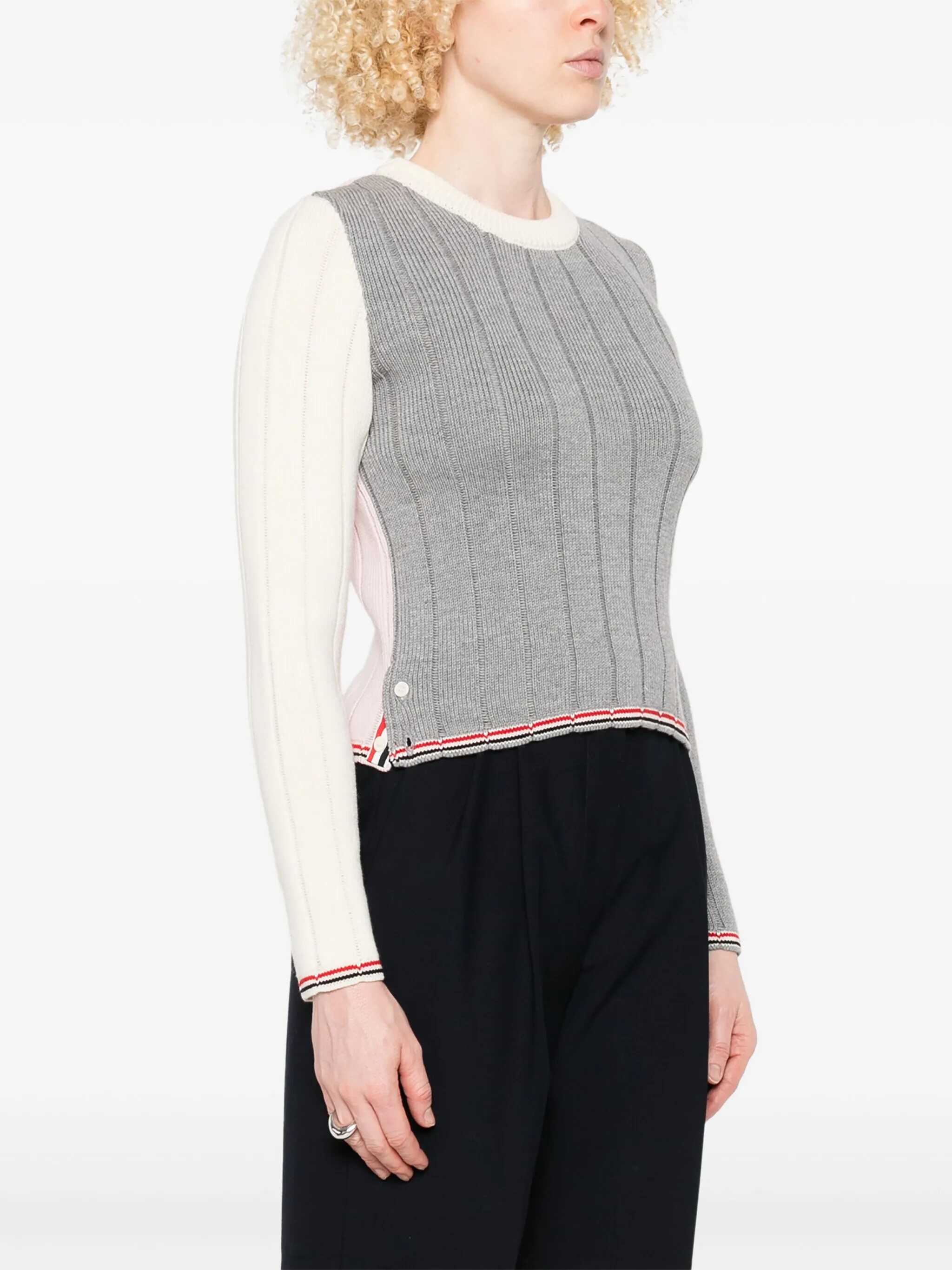 Thom Browne's virgin wool Sweater features an elegant ribbed crew neck and a ribbed weave that enhances the texture. Multicolored panels lend a lively, contemporary touch, while the adjustable side slits with buttons are embellished with the iconic multicolored bands, a detail also echoed on the cuffs and hem. A refined garment that combines comfort and distinctive style.
