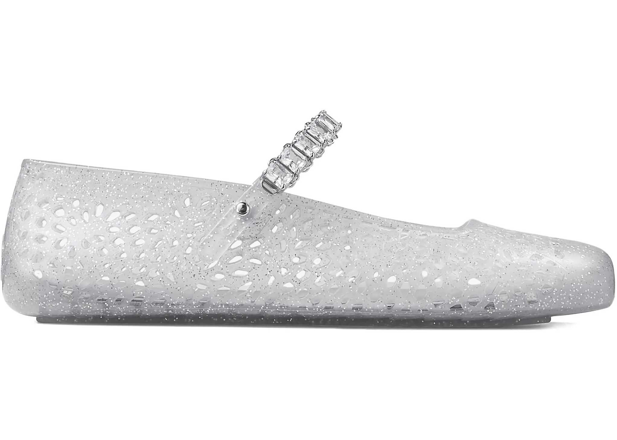Jimmy Choo's Jelly Ballerinas reinterpret a timeless classic with elegance and creativity. The cut-out design, inspired by delicate romantic lace motifs, gives the shoe an ethereal and playful appeal, perfectly balanced by the square toe that adds a contemporary accent. The strap, embellished with sparkling crystals, introduces a touch of glamour that illuminates the nostalgic silhouette. Completing the model is a soft foam insole designed to provide all-day comfort and refined crystal embellishments that reflect the brand's unmistakable elegance.