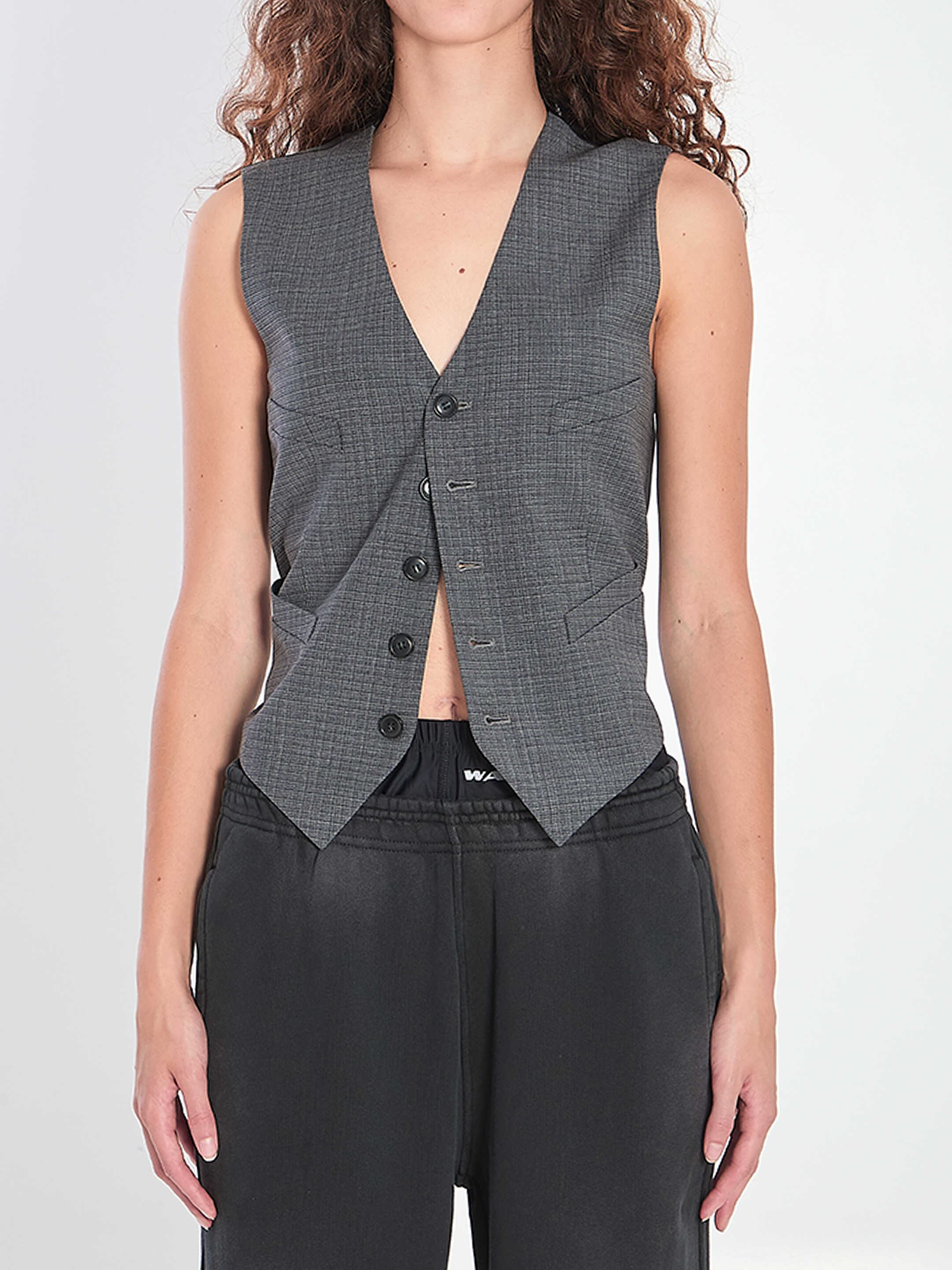 Grey tailored vest in wool blend mélange. Featuring a shaped front, welt pockets, and a removable chain with a key-shaped charm on the back.