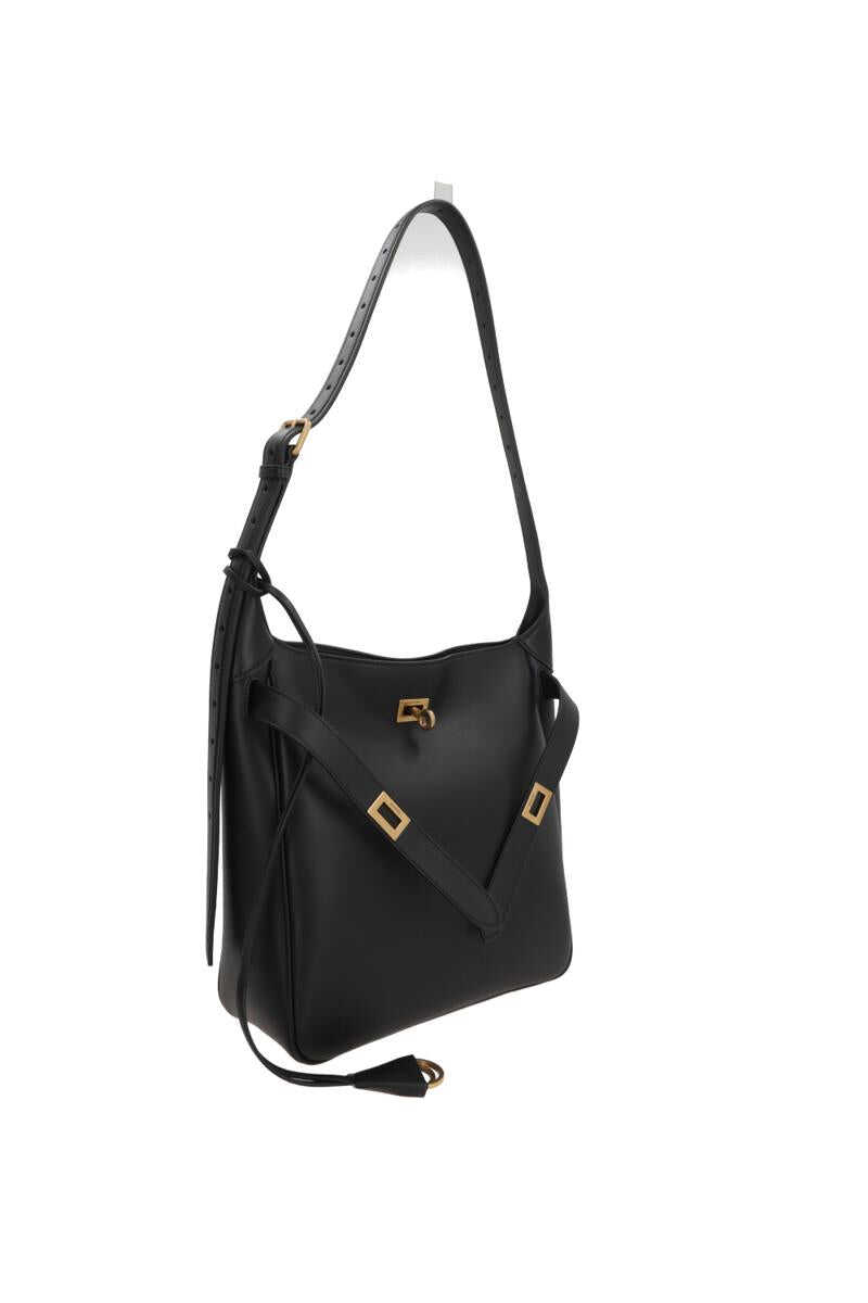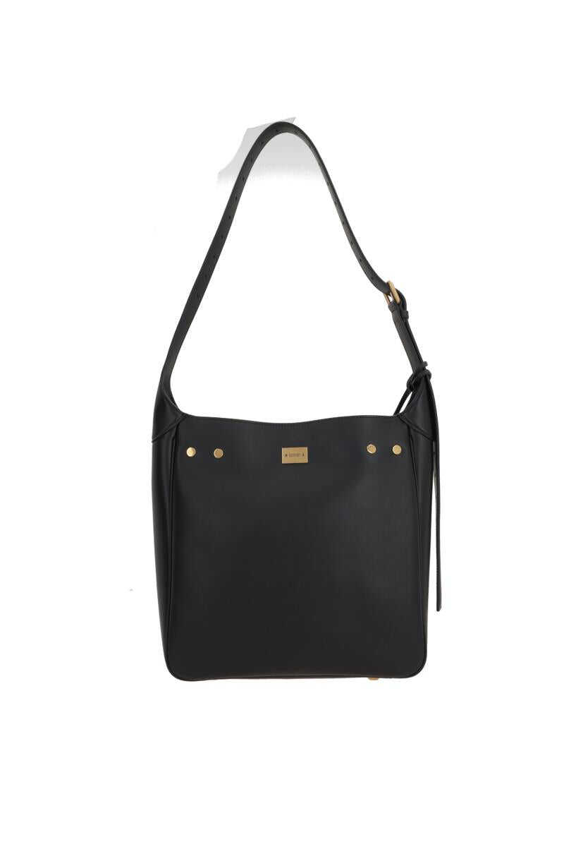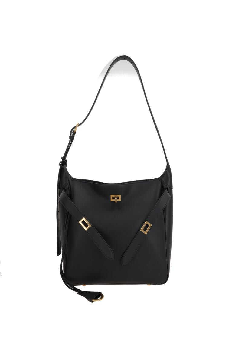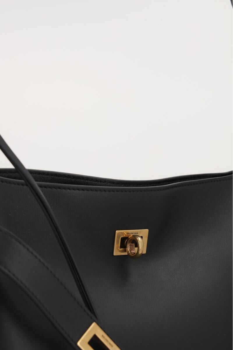 Balenciaga hobo bag crafted from smooth black leather with side straps. Features antiqued gold-tone hardware, a turn-lock closure, adjustable shoulder strap, and metal protective feet. The tone-on-tone nappa-lined interior includes a zip pocket. The design is completed with a removable key holder featuring a double spiral ring.