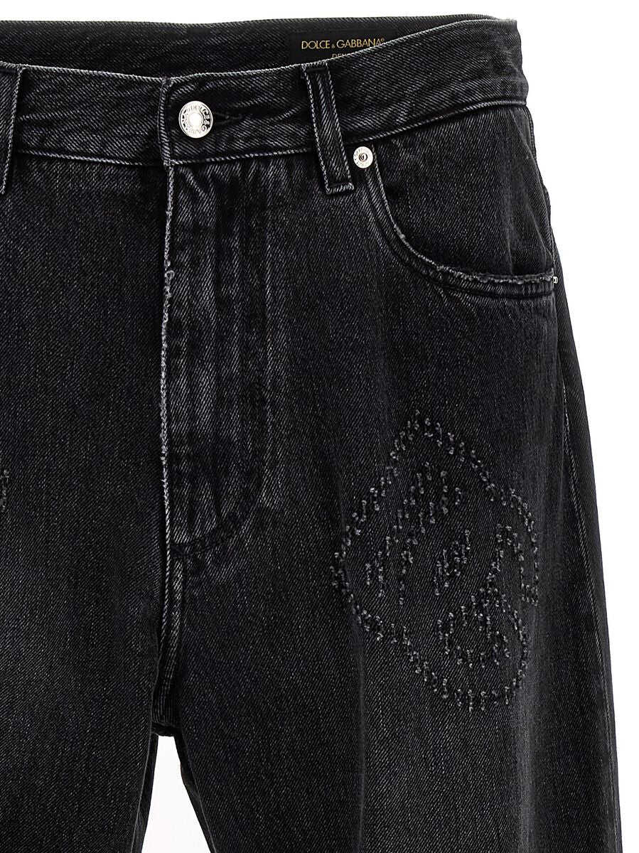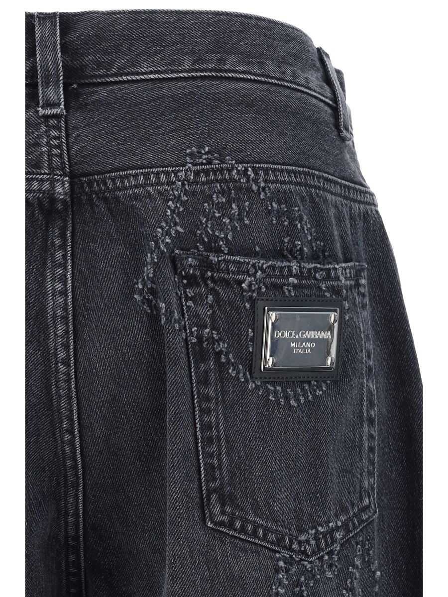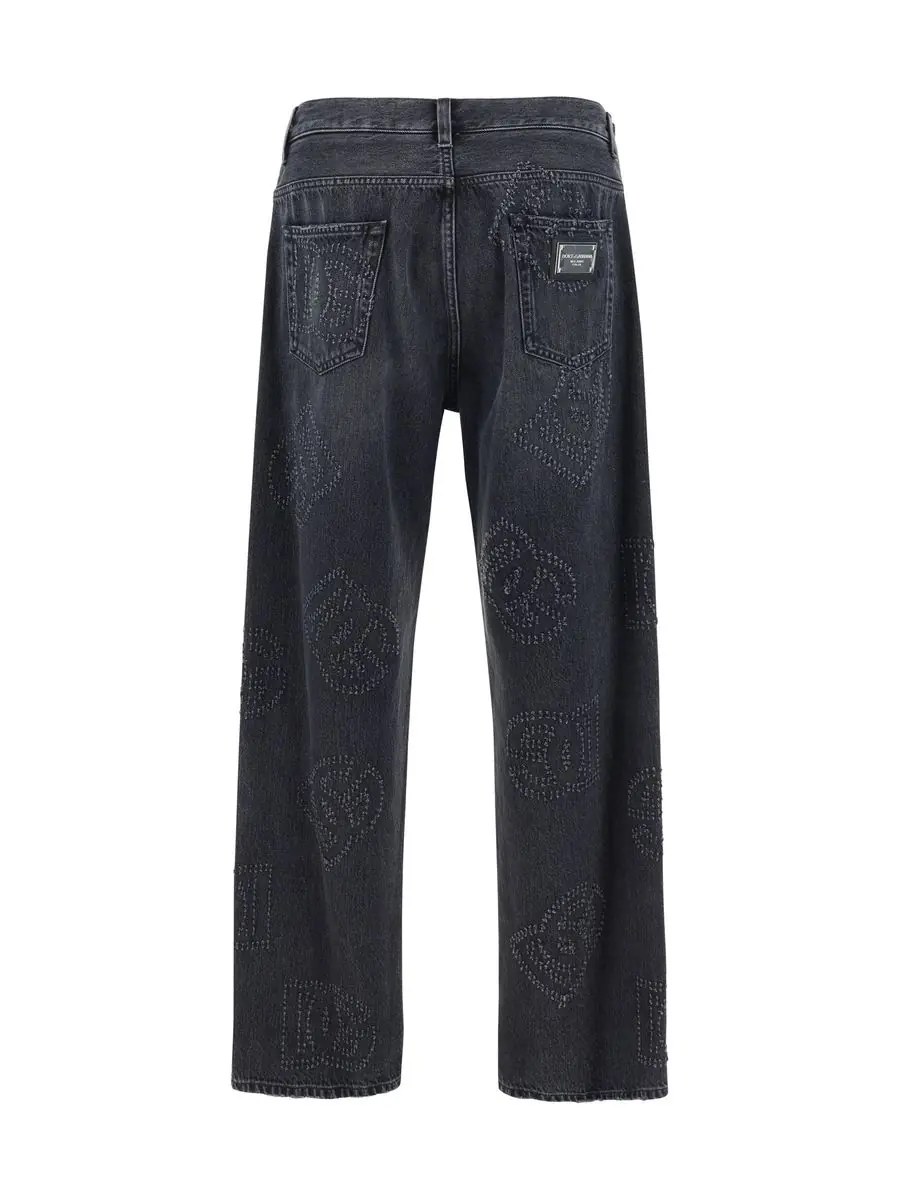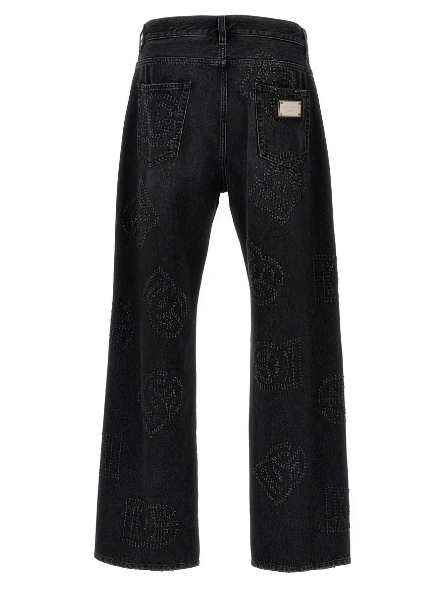 'DG' cotton denim jeans with maxi tear-effect logo, button and zip closure