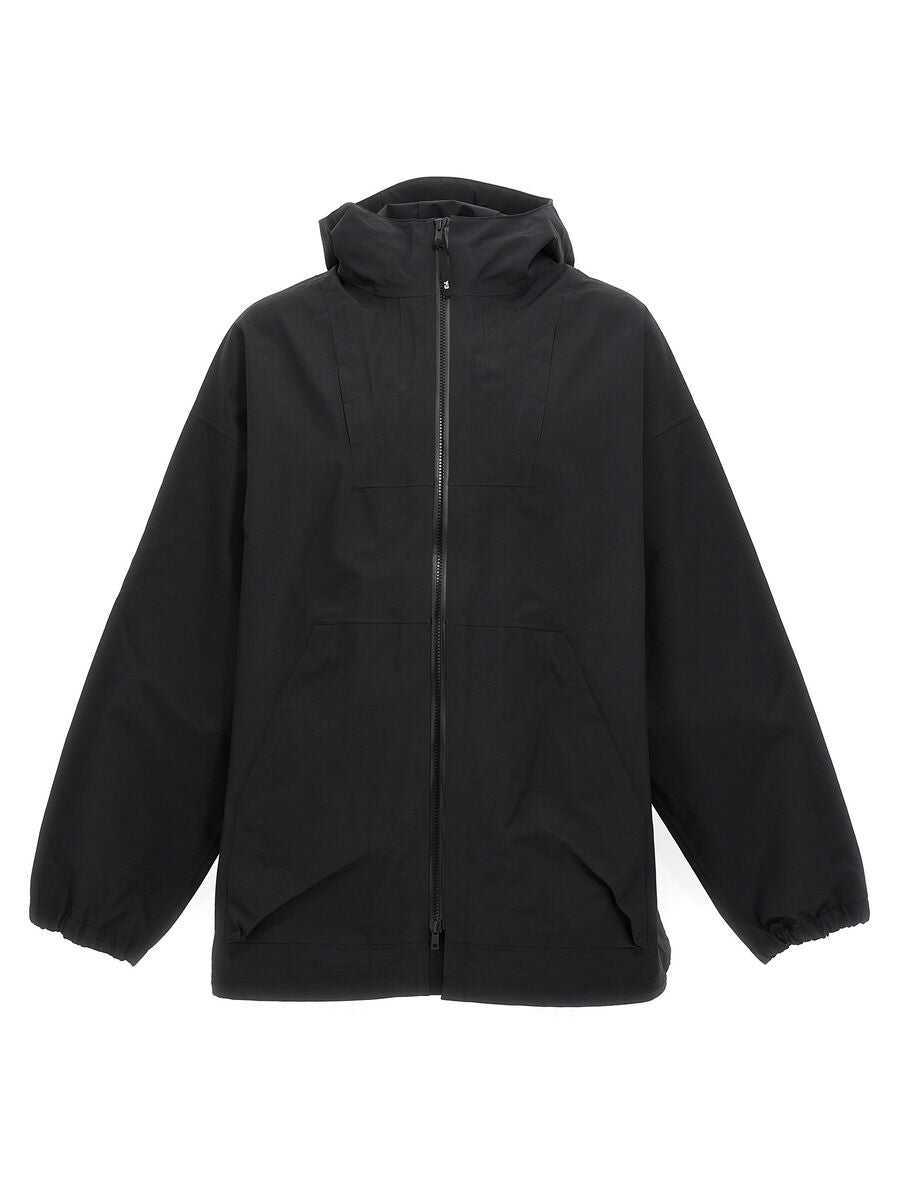 A WATERPROOF, WINDPROOF Y-3 SHELL JACKET. In looking to the outdoors for inspiration, Y-3 explored functionality and unpredictability and found the connection between the two in a technical aesthetic. The Y-3 GORE-TEX Hard Shell Jacket is designed to block out the cold, comfortably layering with a relaxed fit. Hook-and-loop cuffs and the hidden cord stopper help trap heat and keep out the chill. Oversize fit.